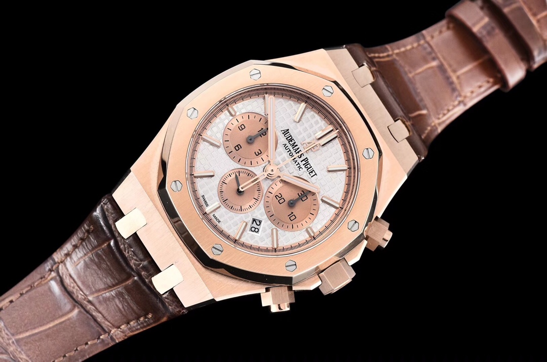 | Audemars Piguet Royal Oak Chronograph 41mm White Dial Rose Gold Bezel Brown Crocodile Strap 26331 | |