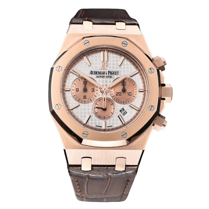 Audemars Piguet Royal Oak Chronograph 41mm White Dial Rose Gold Bezel Brown Crocodile Strap 26331