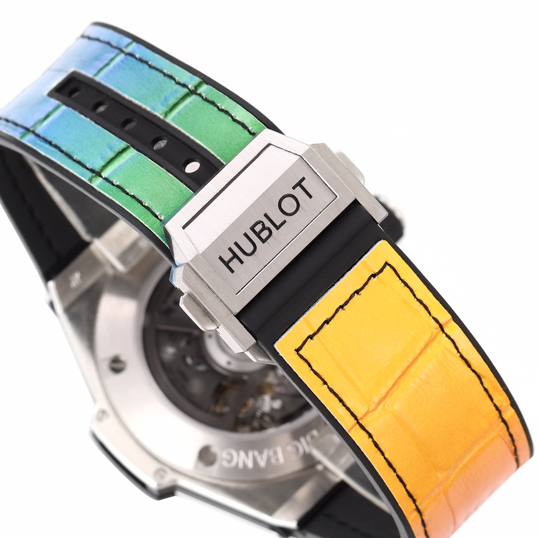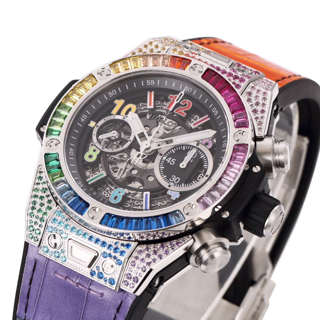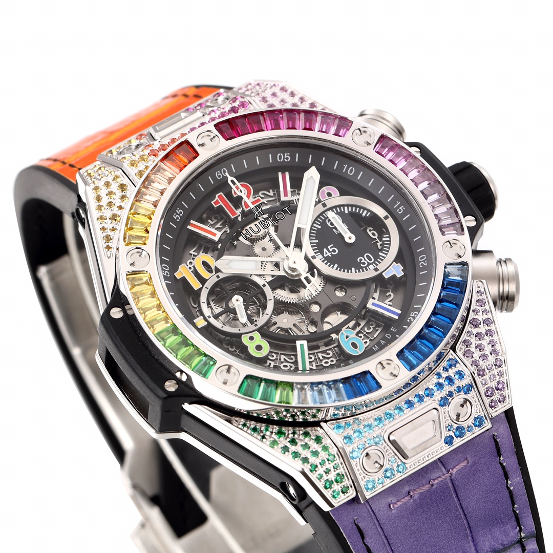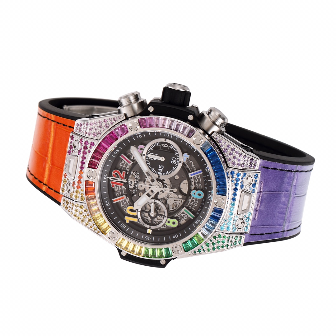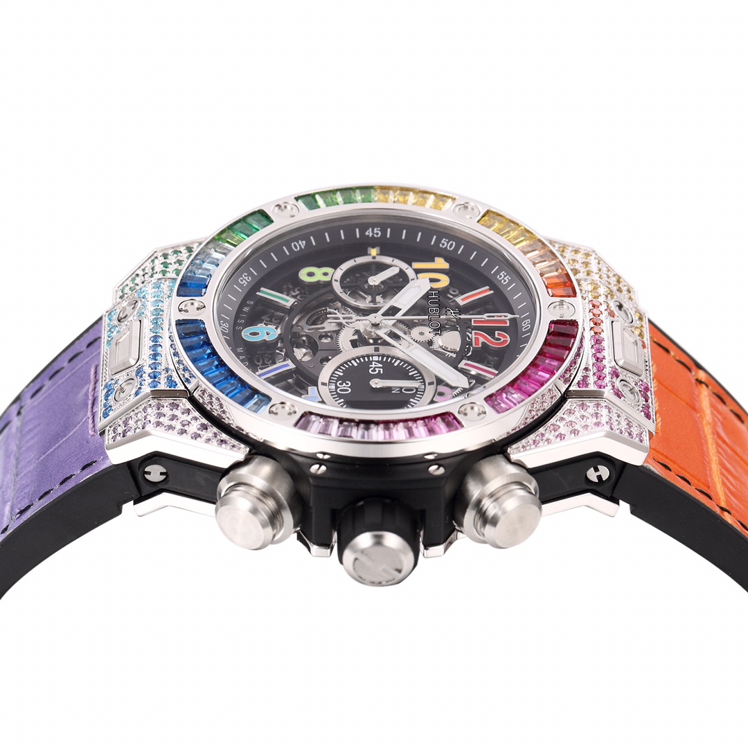 | Hublot Big Bang Unico Rainbow 45mm Dial Titanium Square Diamond Bezel Purple Orange Leather Strap 411.OX.9910.LR.0999 | |