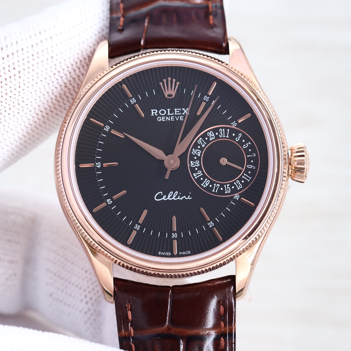 Rolex Cellini Date 39mm White Dial Rose Gold Bezel Brown Leather 50515-0009