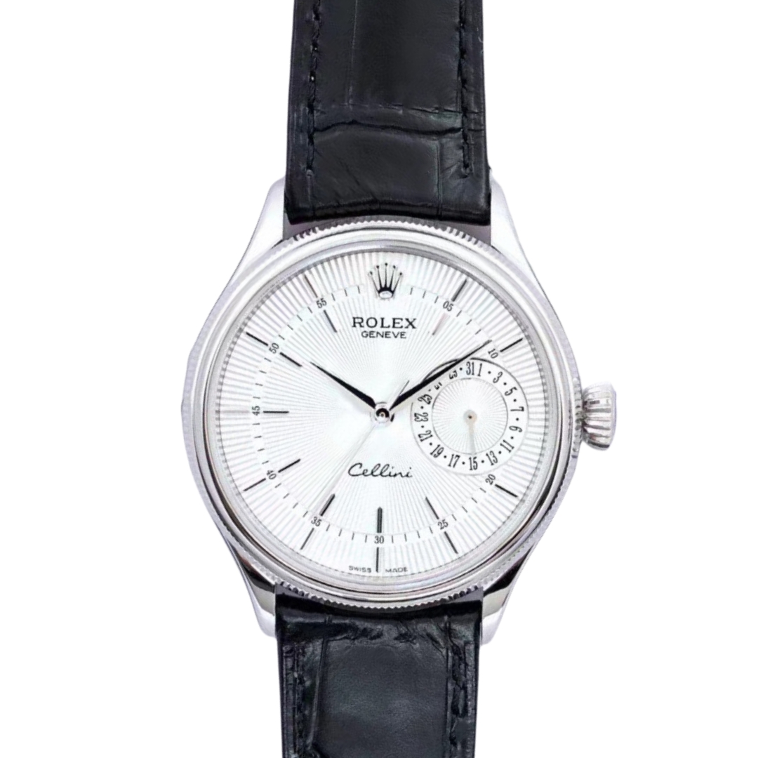 Rolex Cellini Date 39mm White Dial Platinum Bezel Black Leather 50519-0006