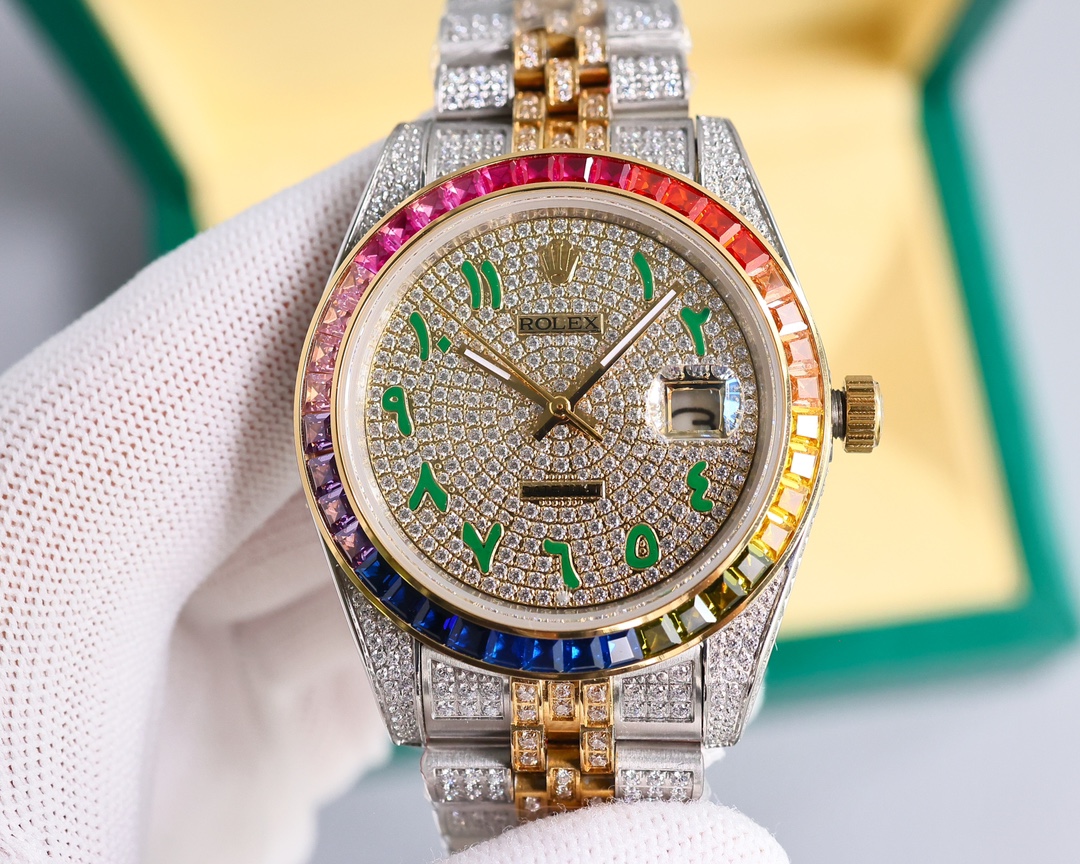 Rolex Datejust Rainbow 41mm Dial Green Arabia Yellow Gold Full Diamonds Deluxe
