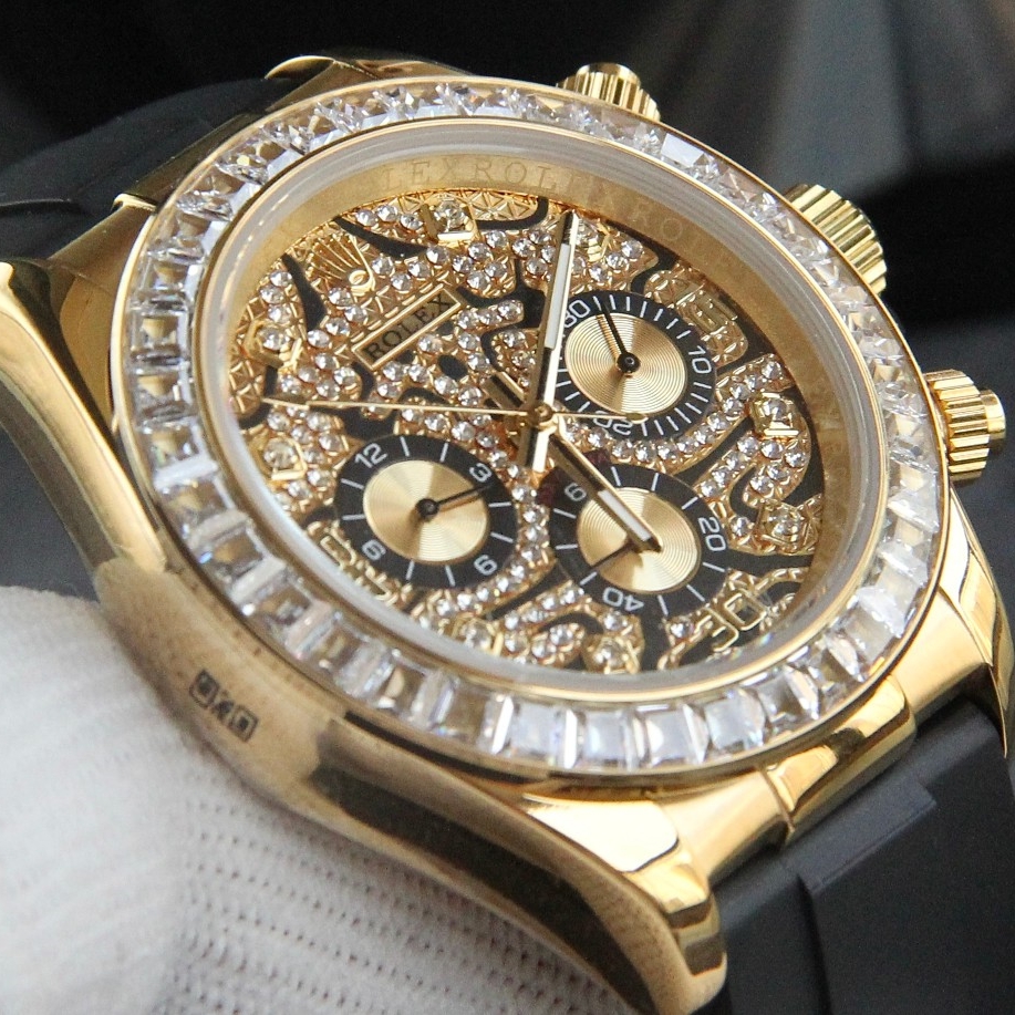 | Rolex Daytona 40mm Yellow Gold Diamond Dial Diamond Bezel Black Rubber Strap 116588TBR Eye of the Tiger | |