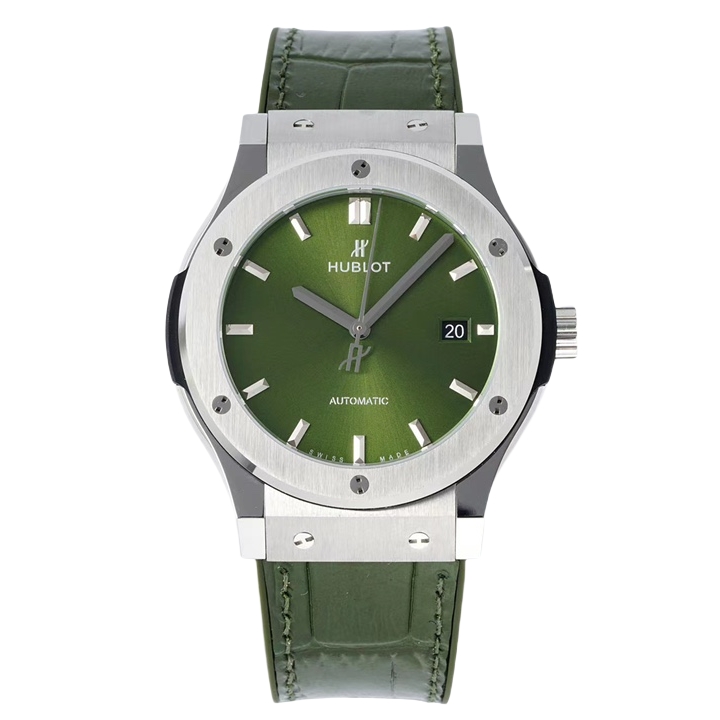 Hublot Classic Fusion 42mm Green Dial Titanium Bezel Green Crocodile Skin Strap 542.NX.8970.LR