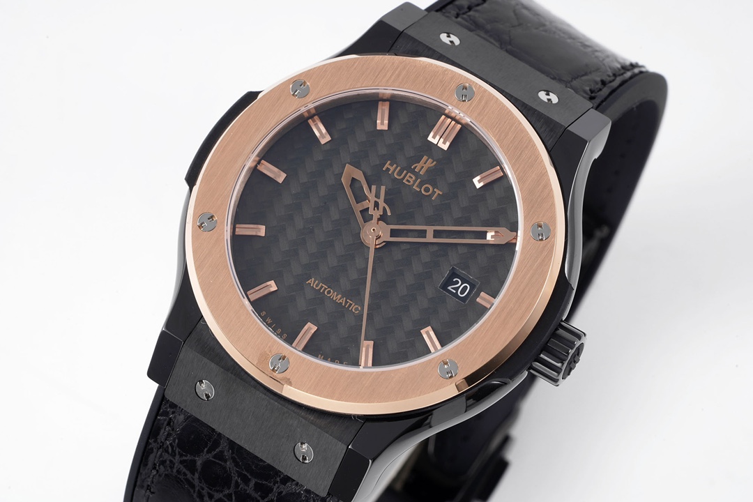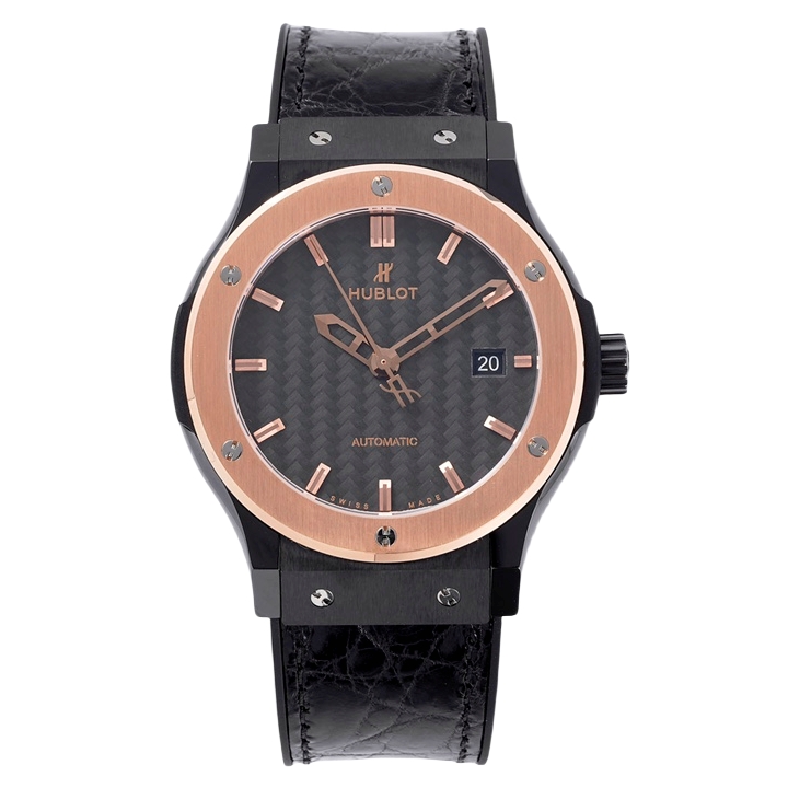Hublot Classic Fusion 42mm Yellow Gold Carbon Fiber Dial Black Ceramics Bezel Black Crocodile Skin Strap 541.CO.1781.LR
