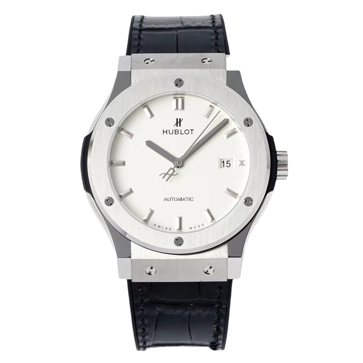 Hublot Classic Fusion 42mm White Dial Titanium Bezel Black Crocodile Skin Strap 542.NX.2611.LR