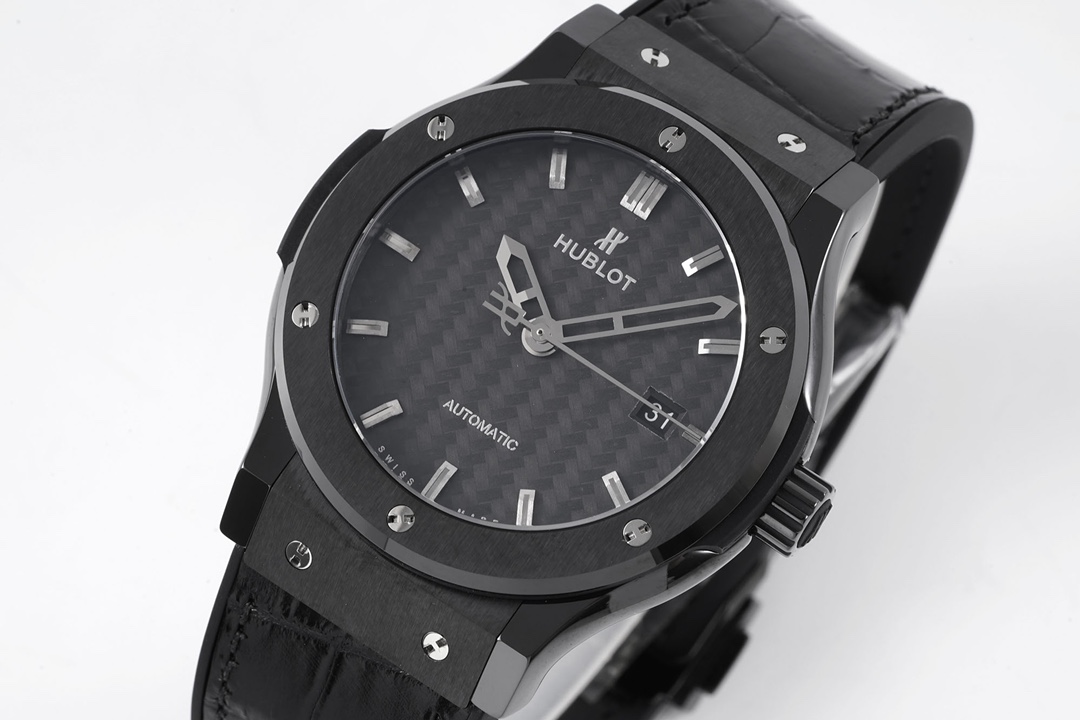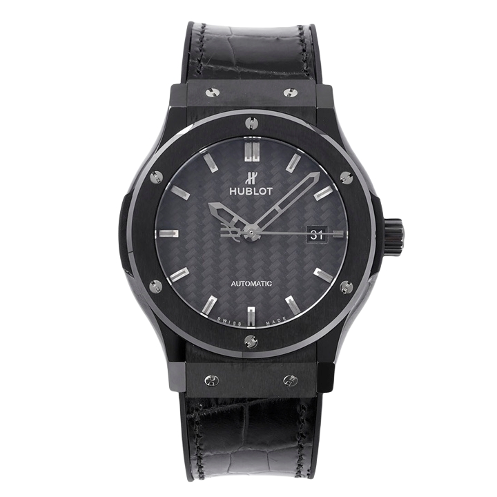 Hublot Classic Fusion 42mm Black Carbon Fiber Dial Black Ceramics Bezel Black Crocodile Skin Strap 541.CM.1771.LR