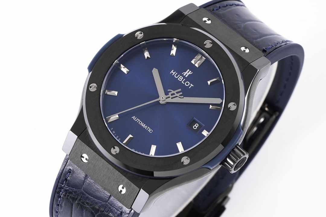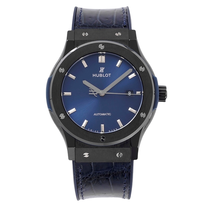 Hublot Classic Fusion 42mm Blue Dial Black Ceramics Bezel Blue Crocodile Skin Strap 542.CM.7170.LR