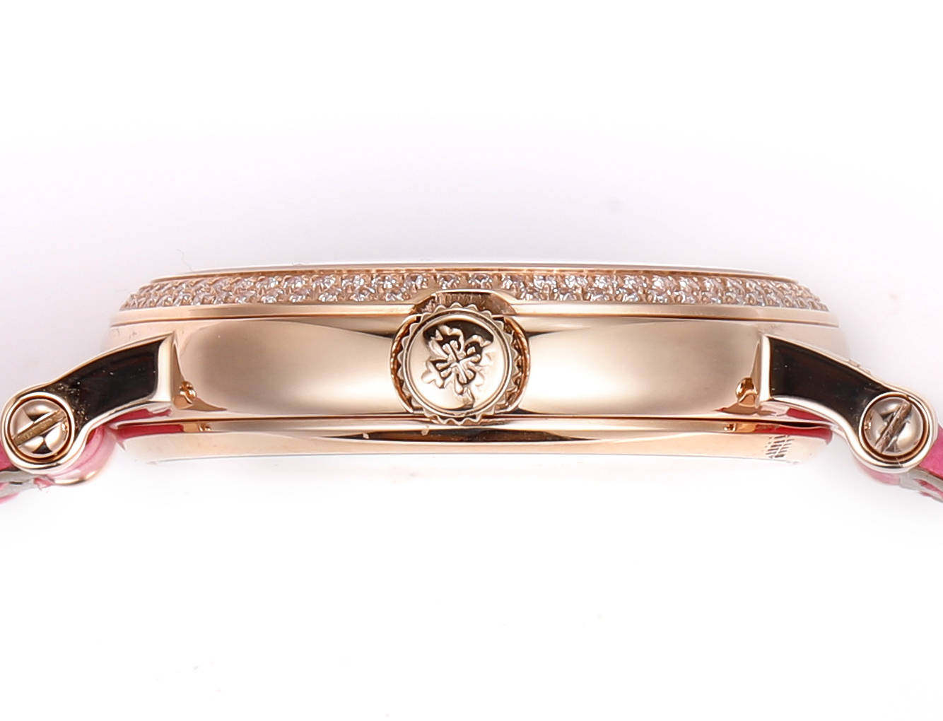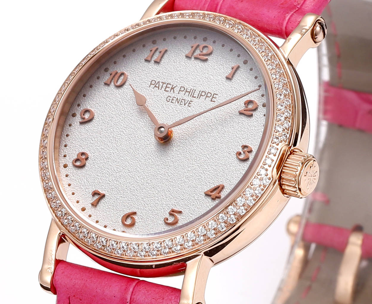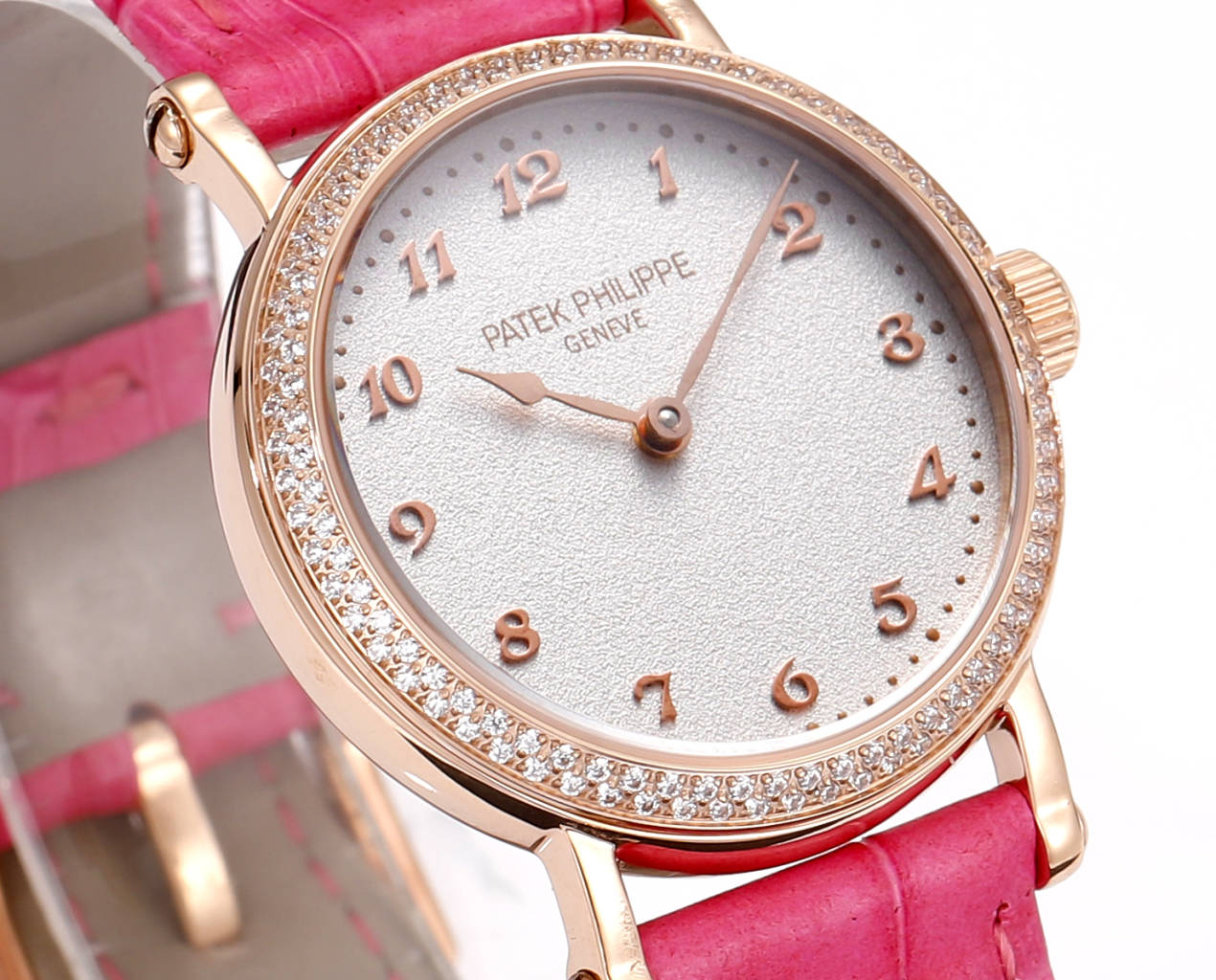 | Patek Philippe Calatrava 34.6mm White Dial Rose Gold Diamond Bezel Rose Red Leather Strap 7200/200R-001 Woman Ladies | |