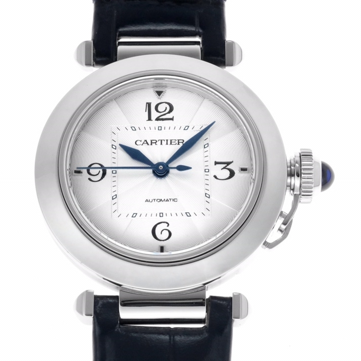 Cartier Pasha 35mm White Dial Steel Bezel Dark Blue Leather Strap WGPA0014 Ladies