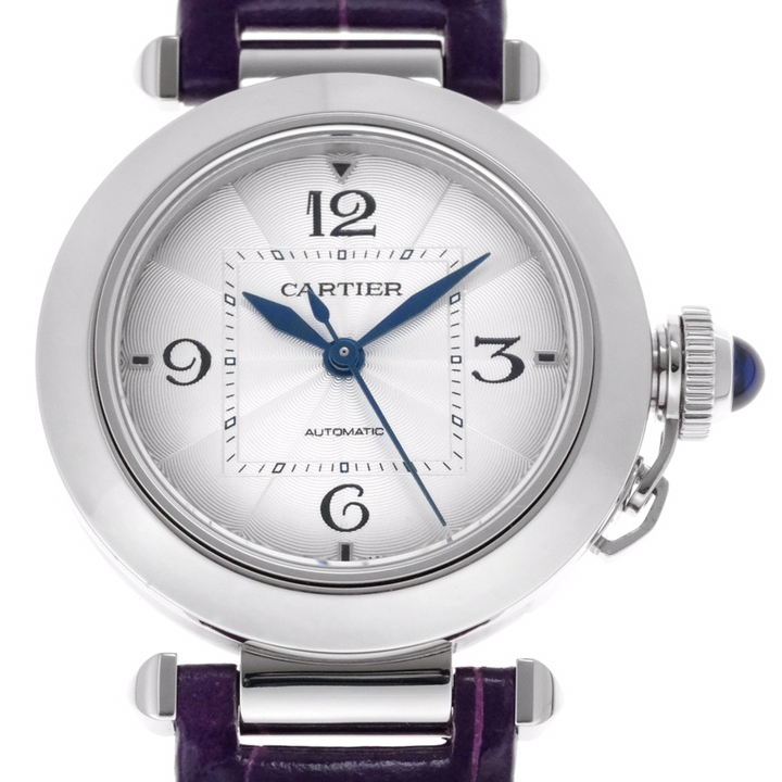 Cartier Pasha 35mm White Dial Steel Bezel Purple Leather Strap WGPA0014 Ladies