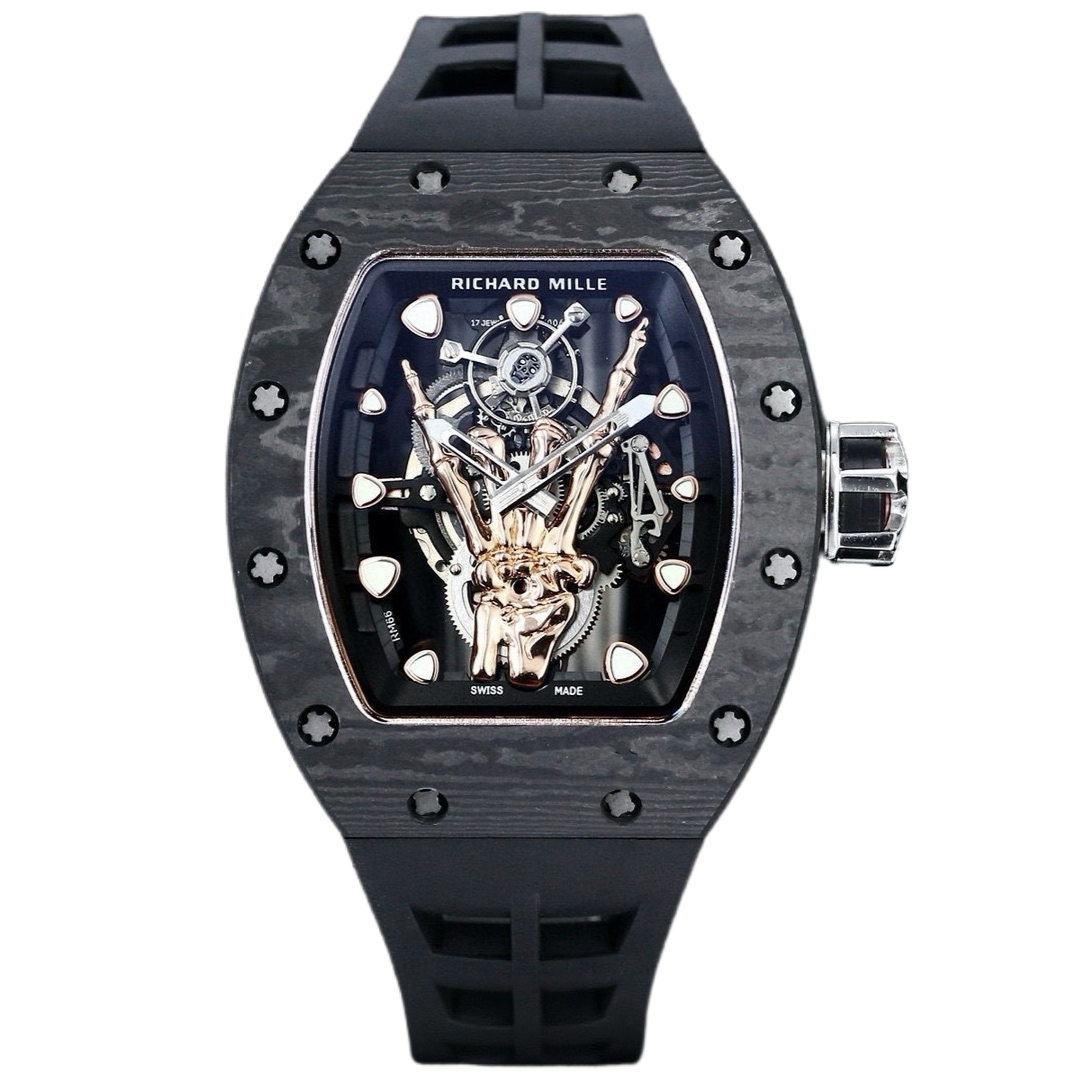 Richard Mille RM66 42.7mm x 49.94mm Gold Finger Hollow Dial Black Carbon Fiber Bezel Black Rubber Strap