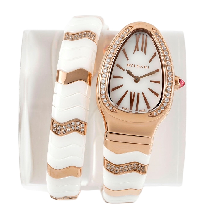 BVLGARI Serpenti Spiga 35mm White Dial Rose Gold Diamond Bezel White Ceramics Rose Gold Diamond Strap 102202 SPP35WGDWCGD1.1T Ladies Woman