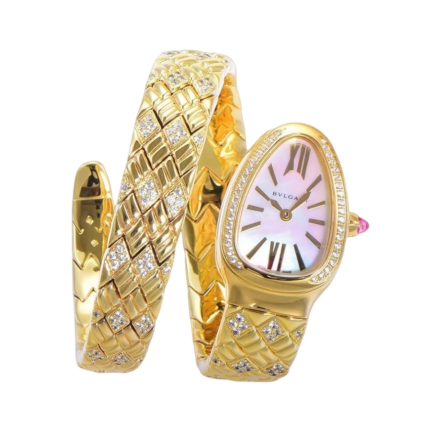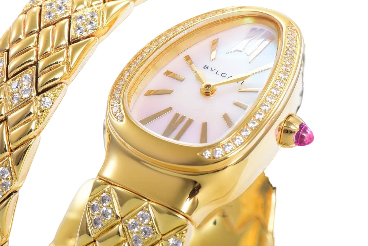 BVLGARI Serpenti Spiga 35mm White Pearl Dial Yellow Gold Diamond Bezel Yellow Gold Diamond Strap 103747 Ladies Woman