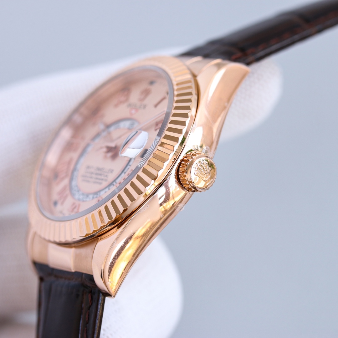 Rolex Sky-Dweller 42mm Pink Dial Rose Gold Bezel Brown Leather Roman Numeral 326135-0004