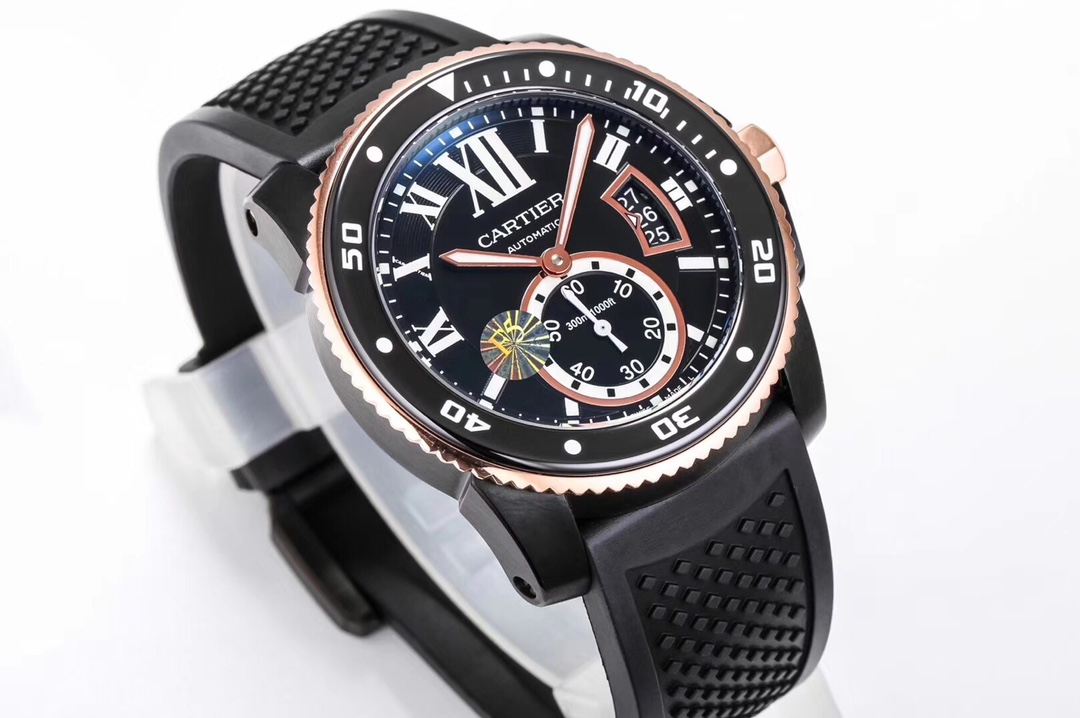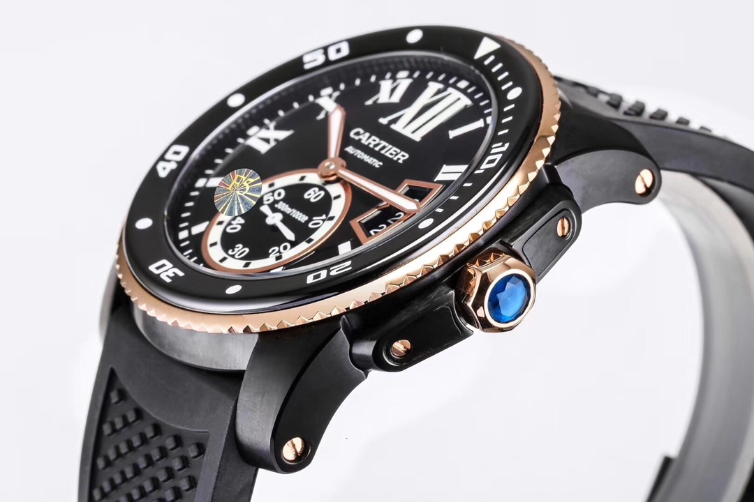 Cartier Calibre 42mm Blue Dial Black Rose Gold Bezel Black Rubber Strap W2CA0004