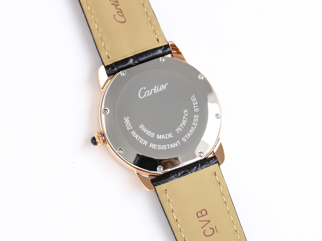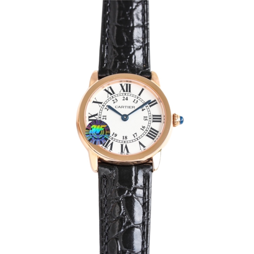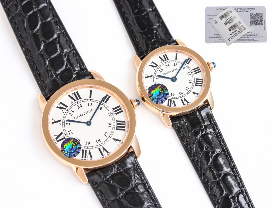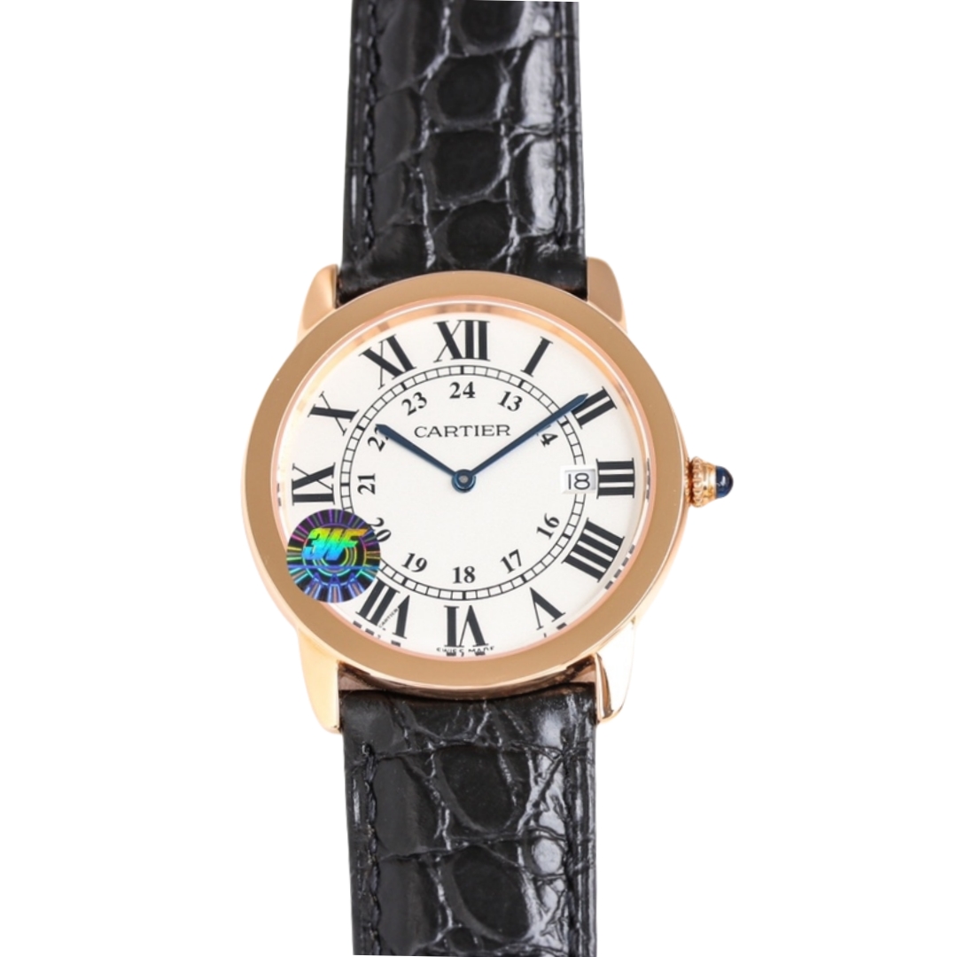 | Cartier Ronde Steel 36mm 29mm White Dial Rose Gold Bezel Black Leather Strap WRRN0013 | |