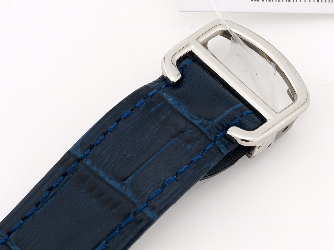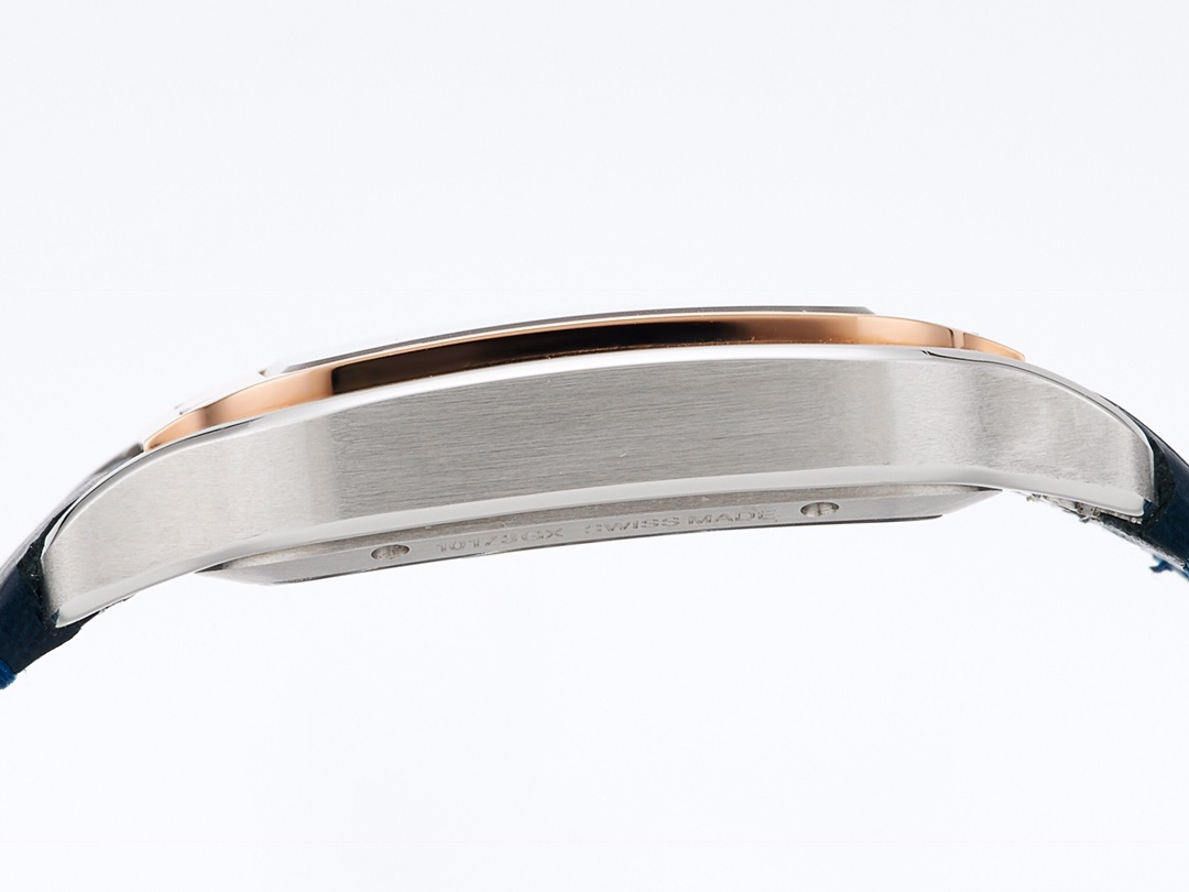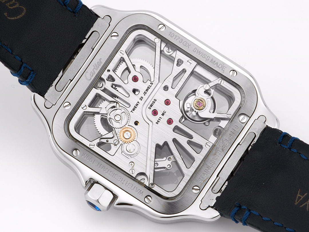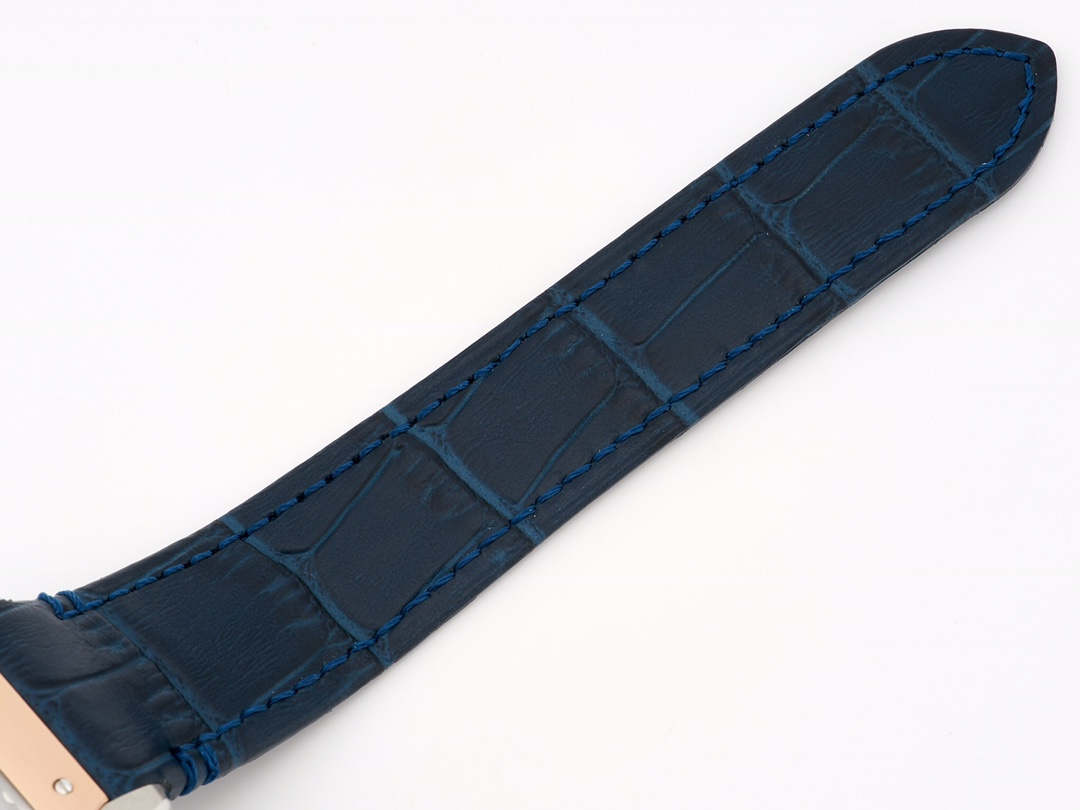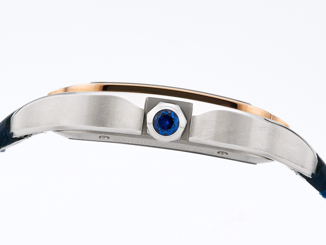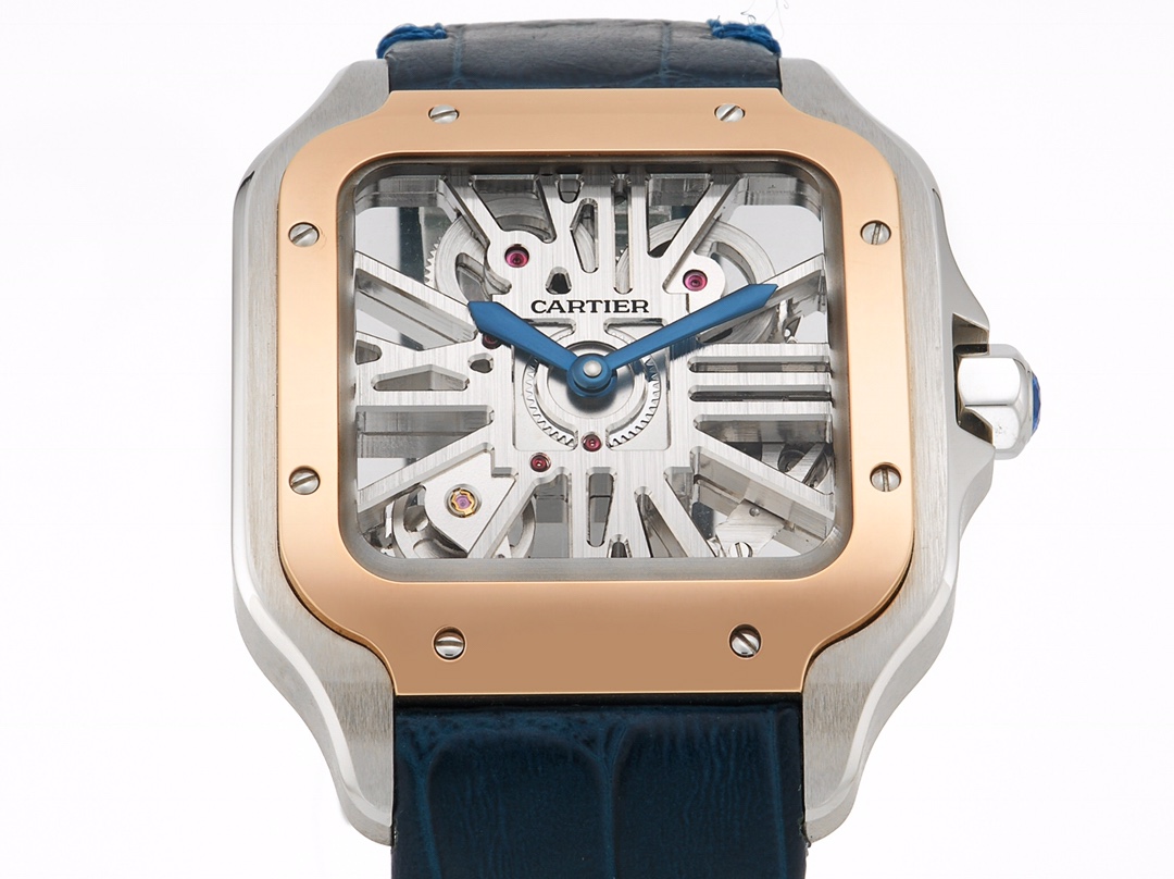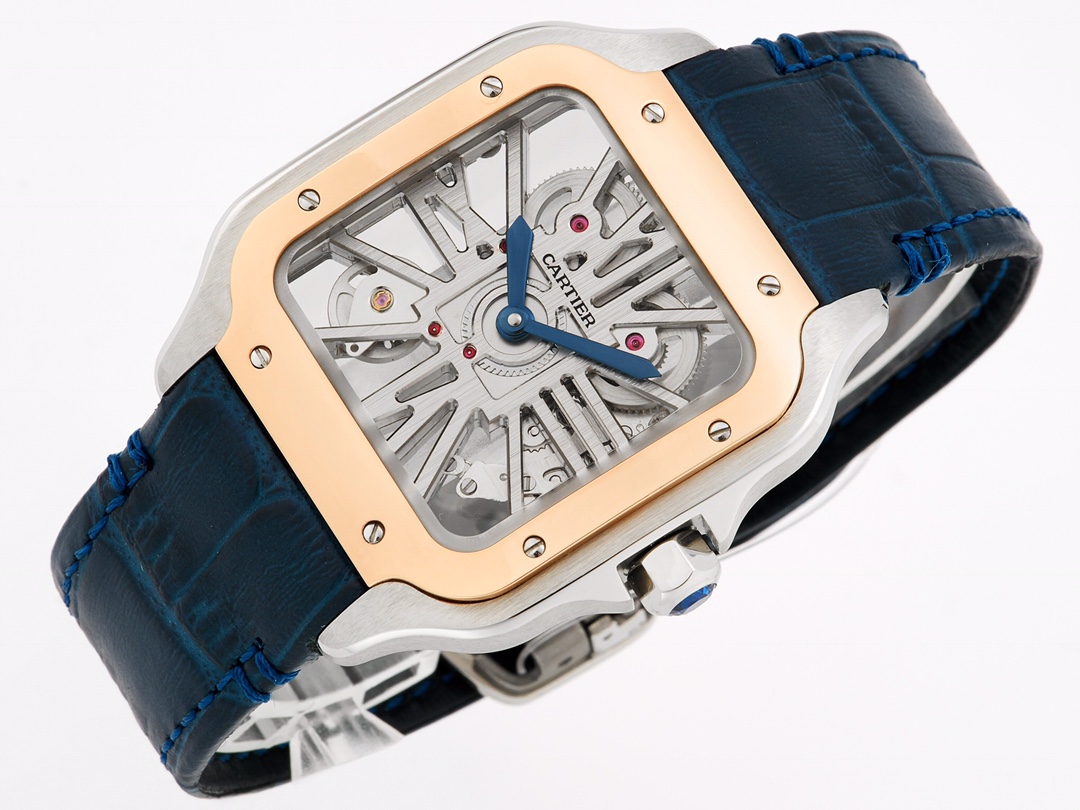 | Cartier Santos 39.8mm Hollow Dial Rose Gold & Steel Bezel Blue Leather Strap WHSA00XX | |