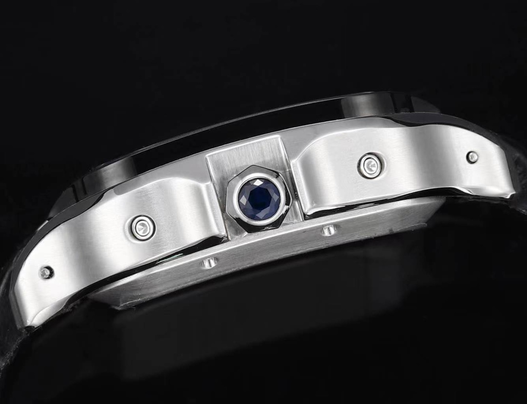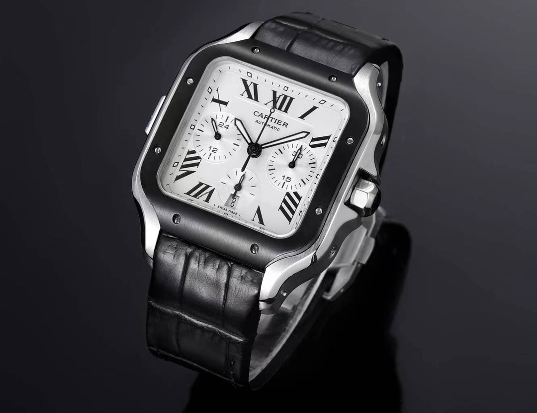 | Cartier Santos 43.3mm White Dial Steel Black Bezel Black Leather Strap WSSA0017 | |