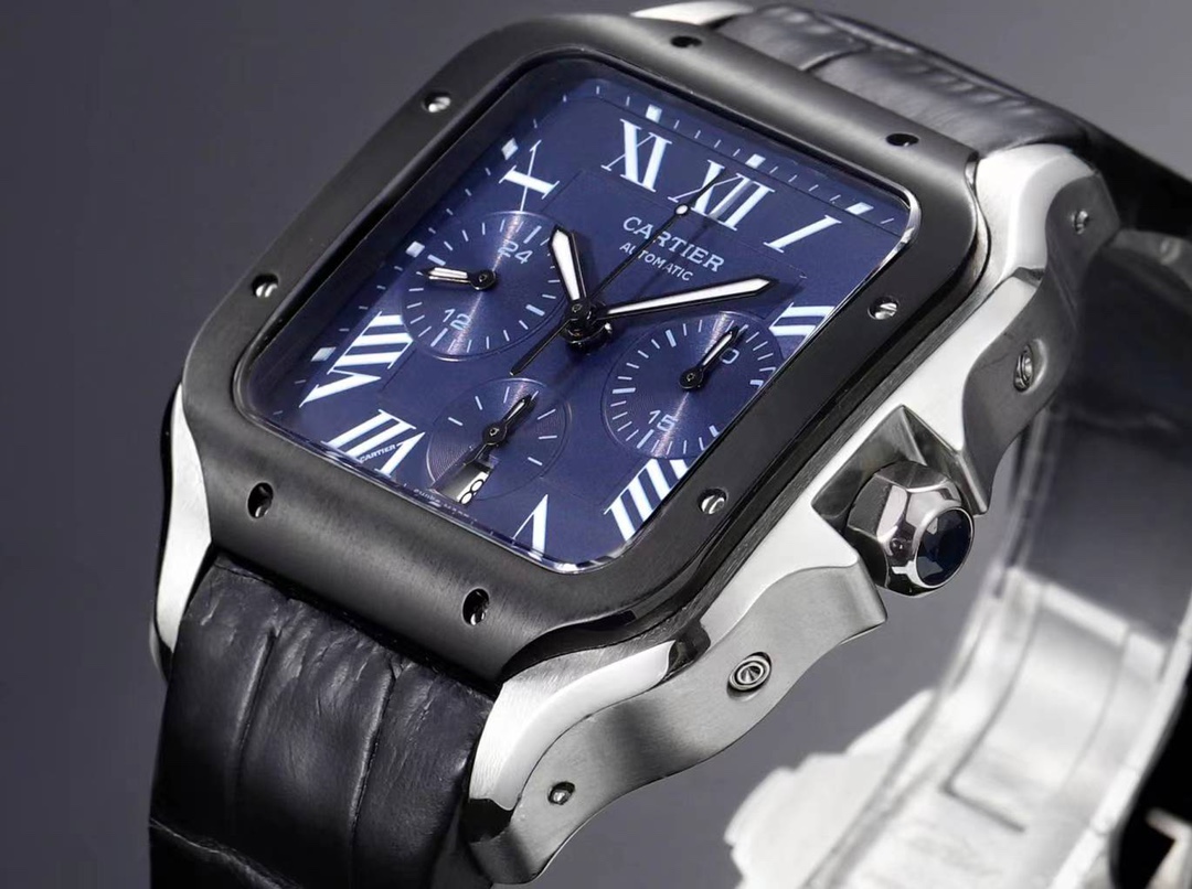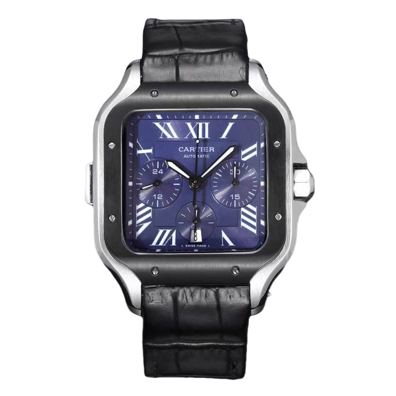 Cartier Santos 43.3mm Blue Dial Steel Black Bezel Black Leather Strap WSSA0117