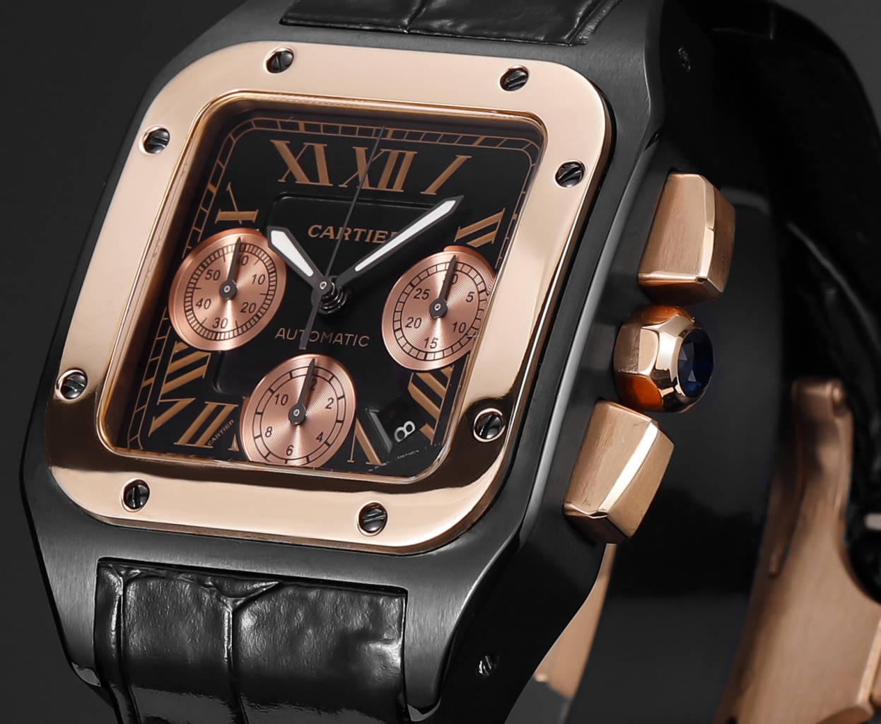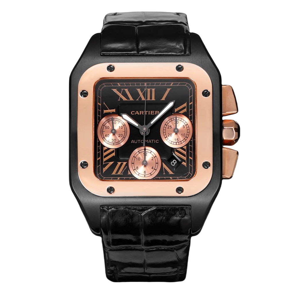 Cartier Santos 42mm Black Rose Gold Dial Rose Gold Black Bezel Black Leather Strap W2020004