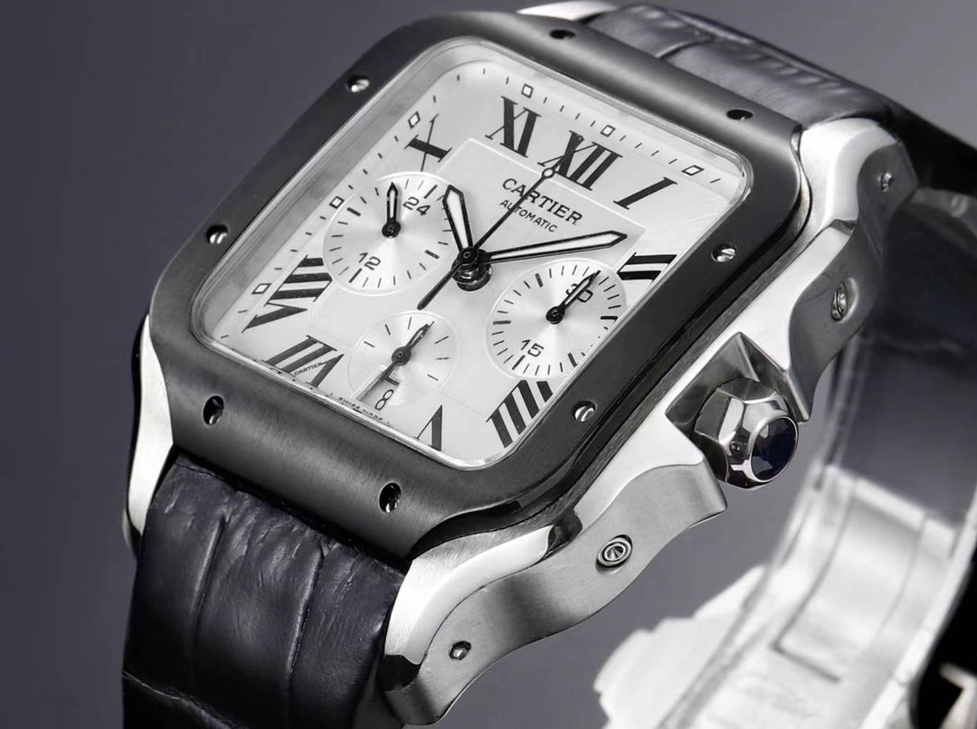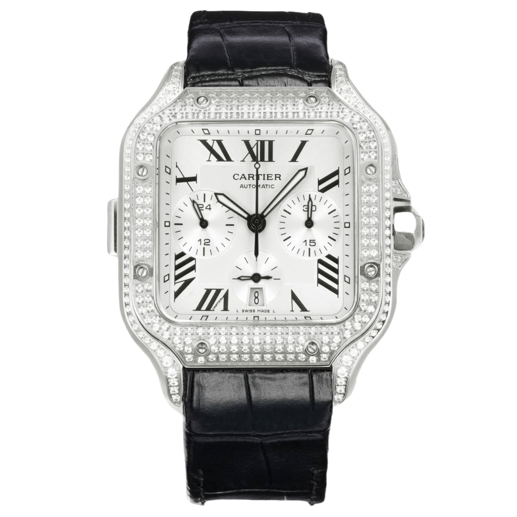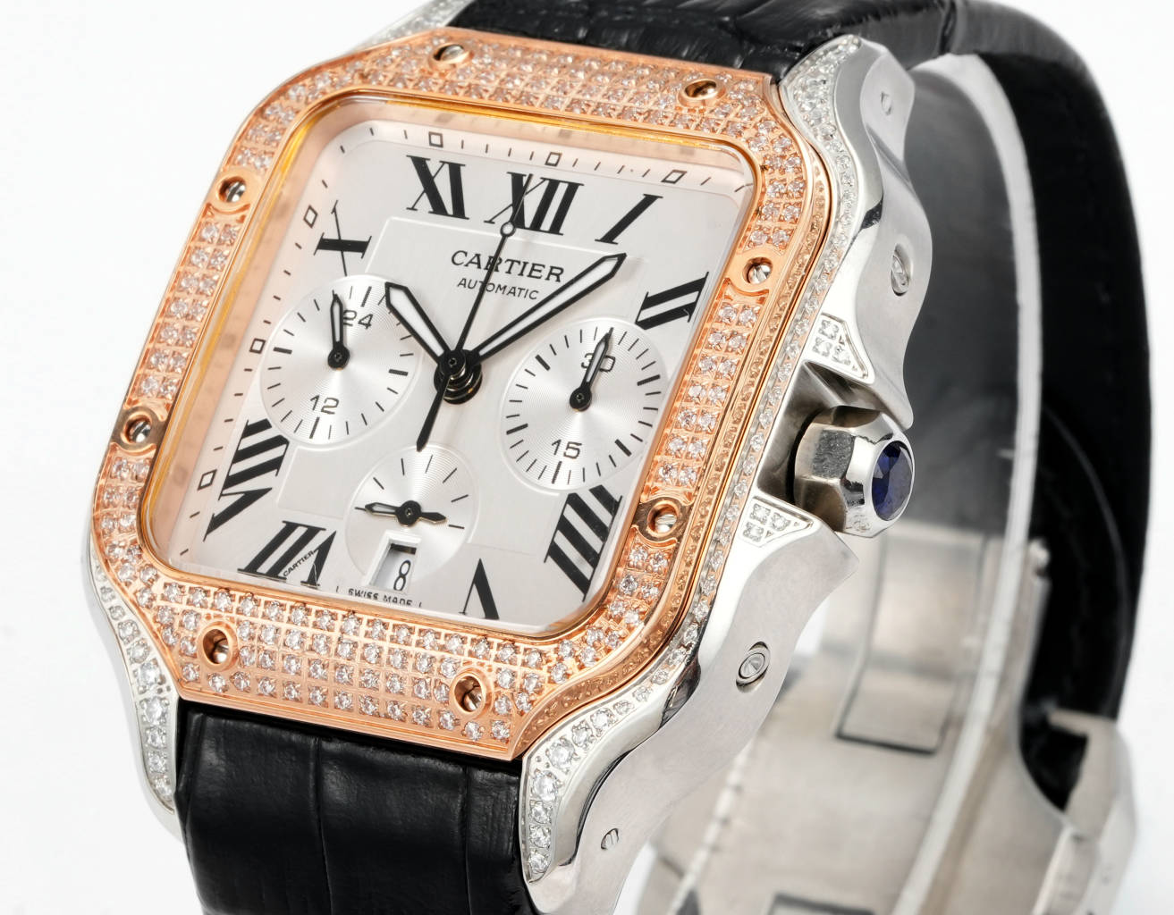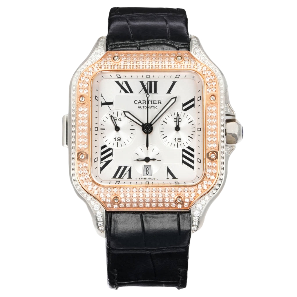 Cartier Santos 43.3mm White Dial Rose Gold Steel Diamond Bezel Black Leather Strap WSSAG017