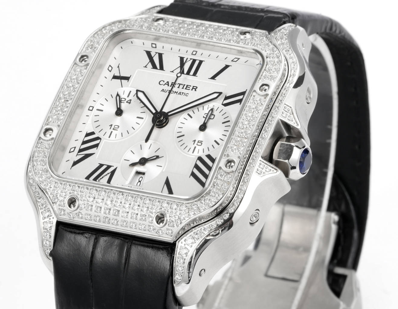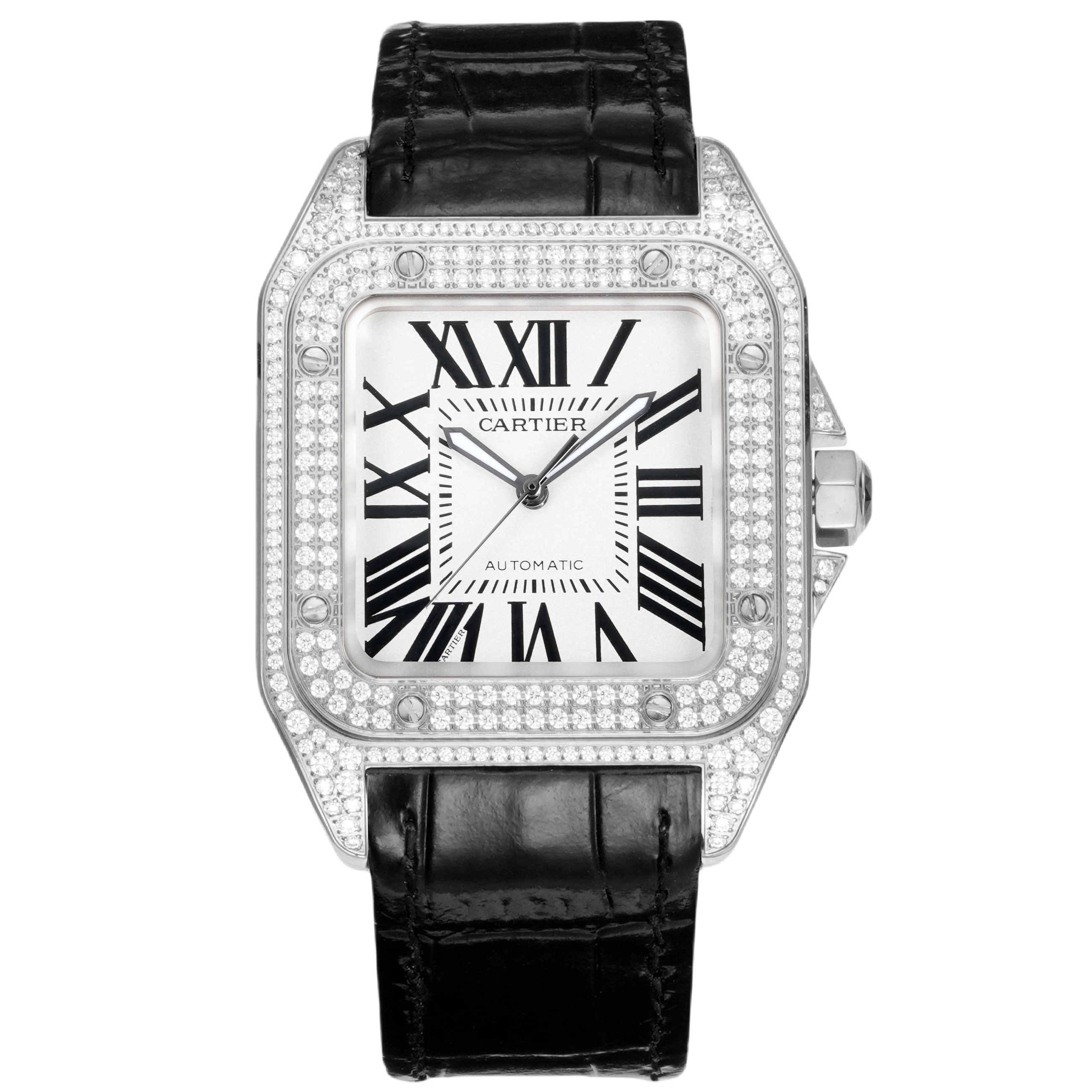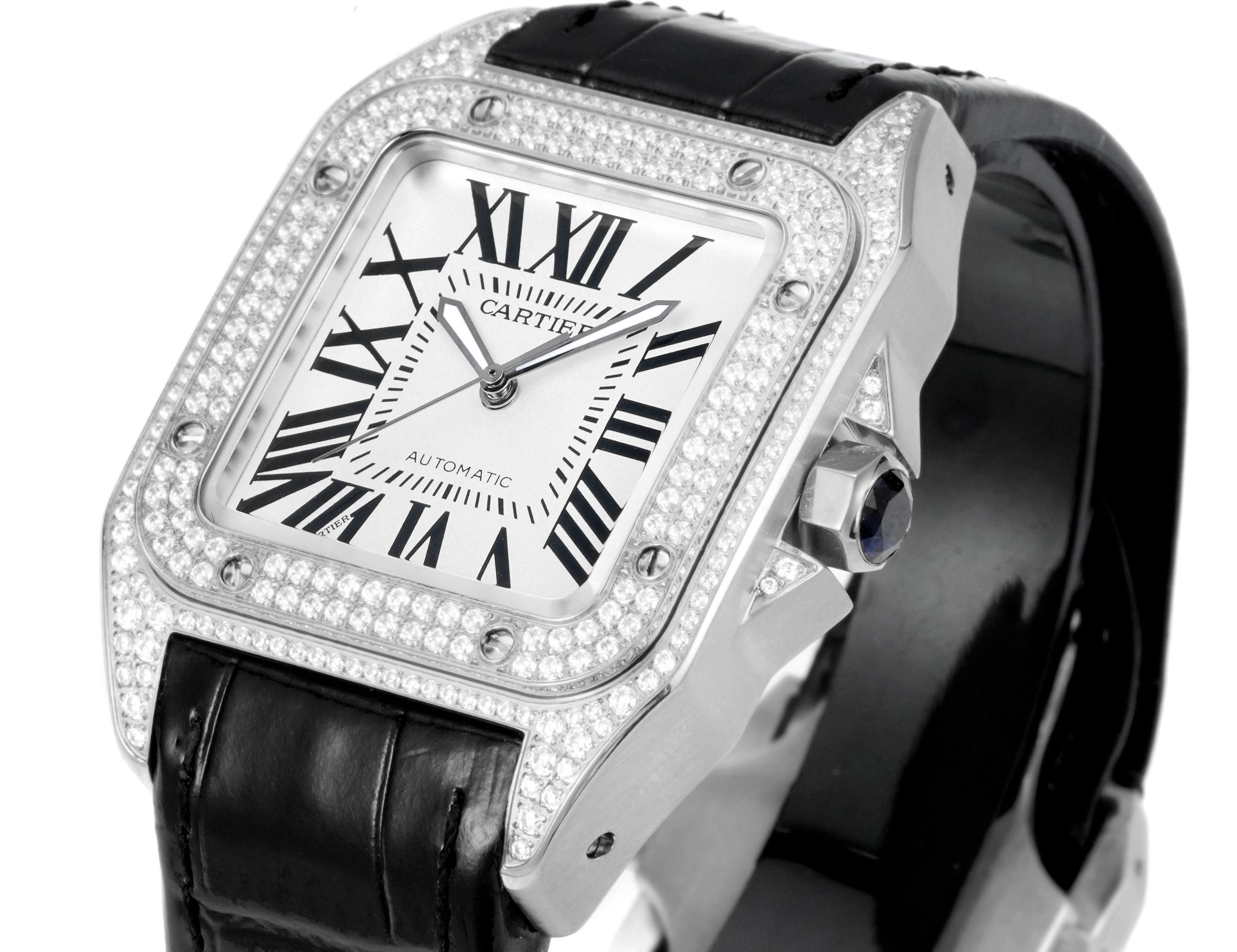 Cartier Santos 43.3mm White Dial Steel Diamond Bezel Black Leather Strap WSSA0G17