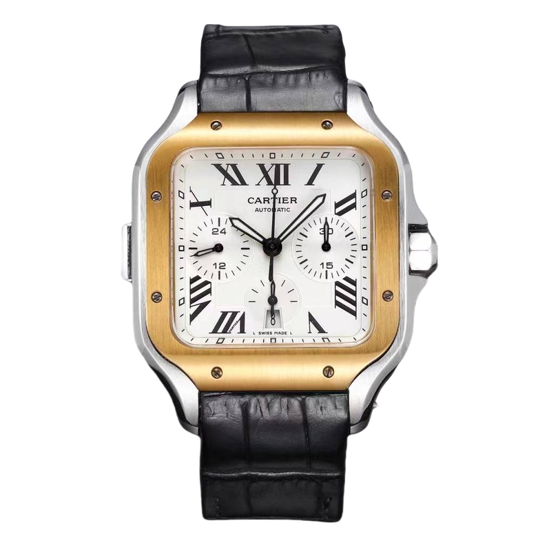 Cartier Santos 43.3mm White Dial Steel Rose Gold Bezel Black Leather Strap WSSA1017