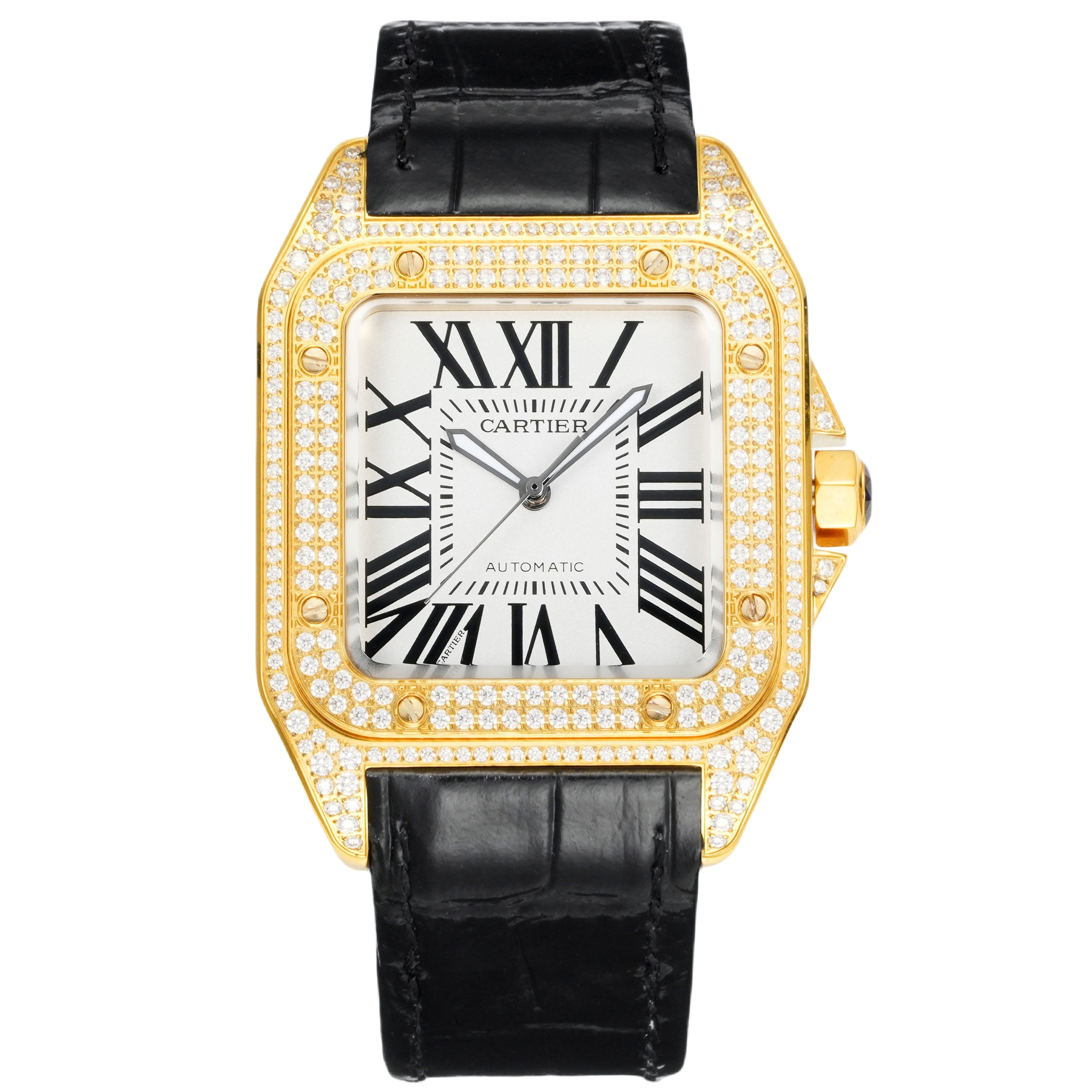Cartier Santos 41.3mm White Dial Yellow Gold Diamond Bezel Black Leather Strap W27071Y1
