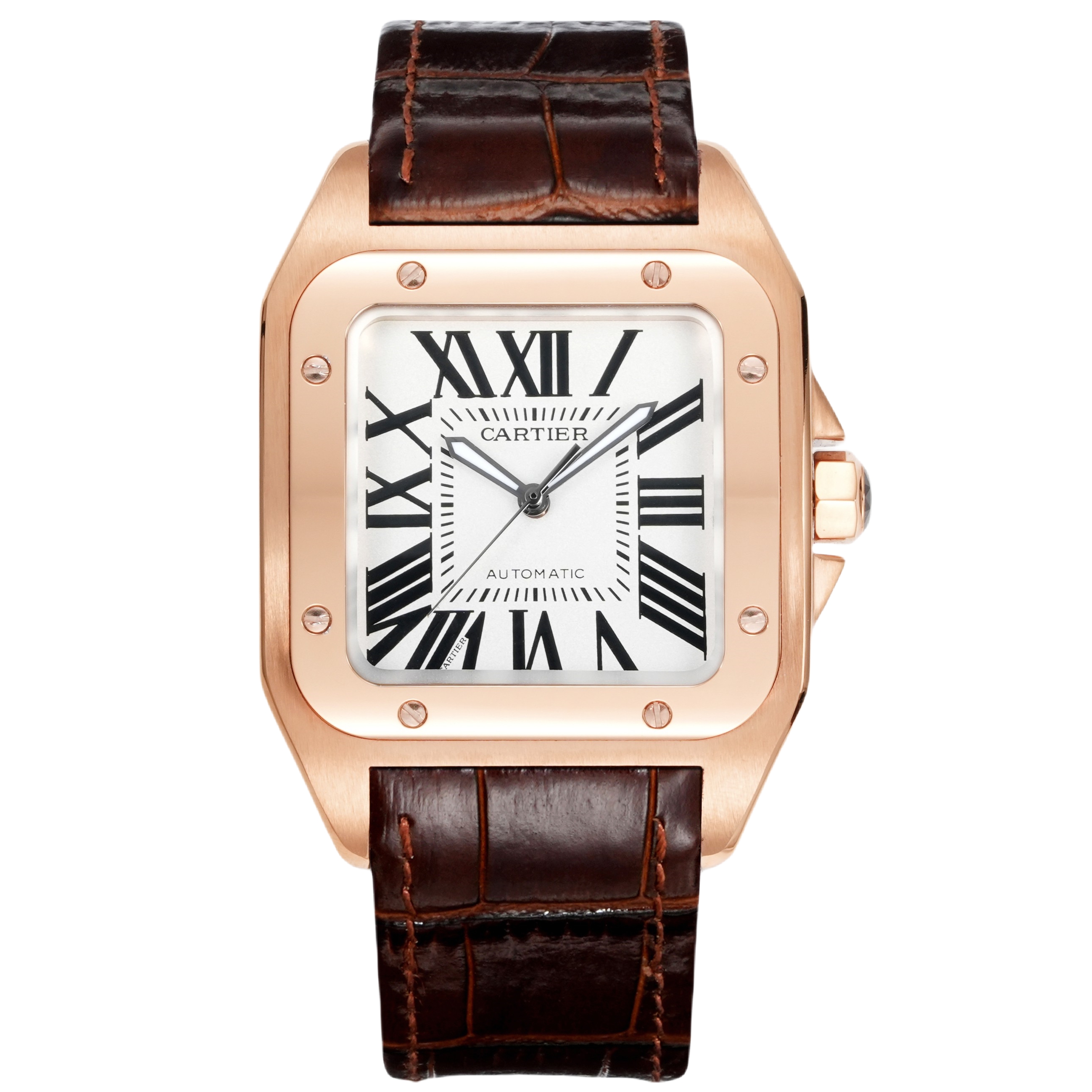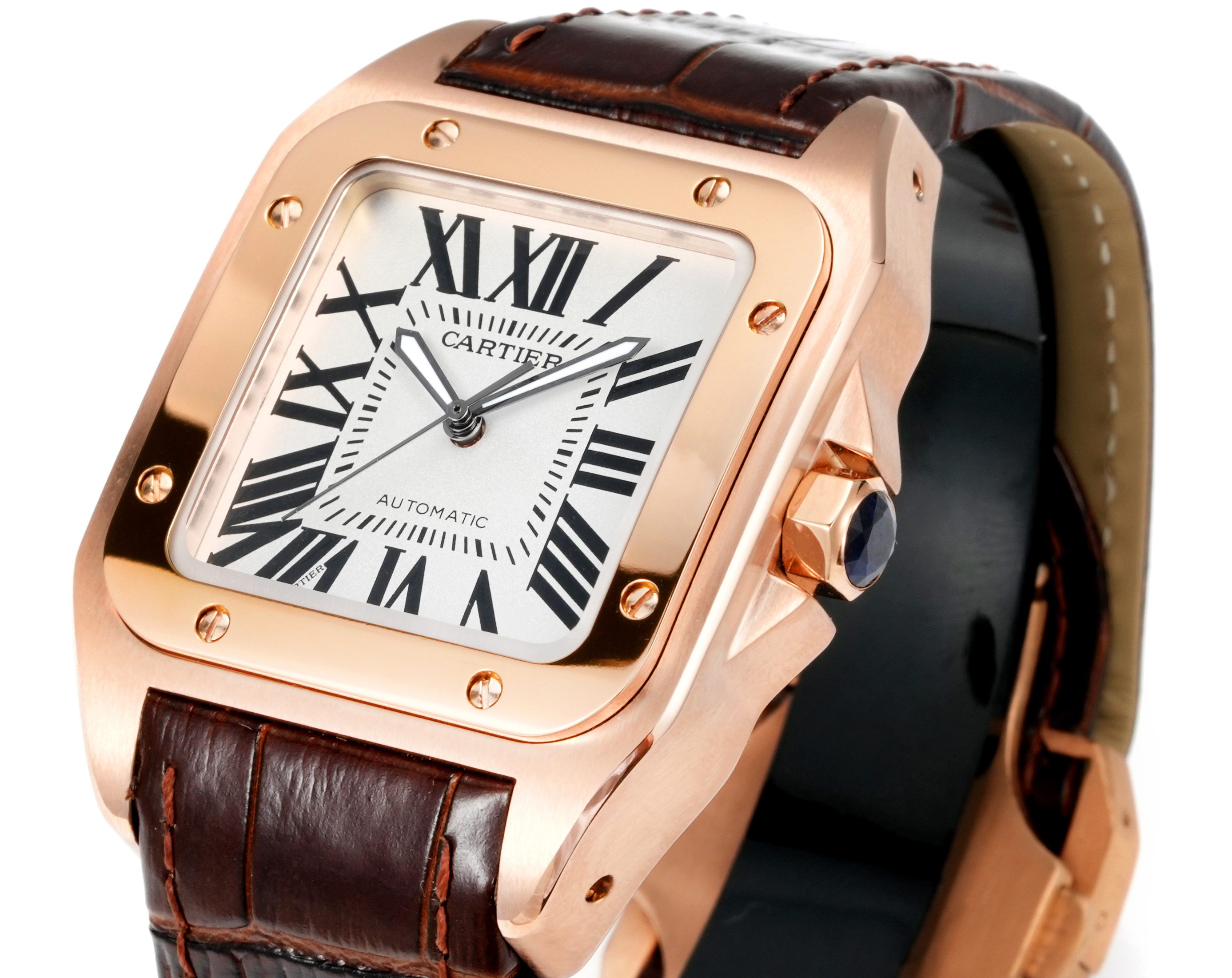 Cartier Santos 41.3mm White Dial Rose Gold Bezel Brown Leather Strap W21071Y1