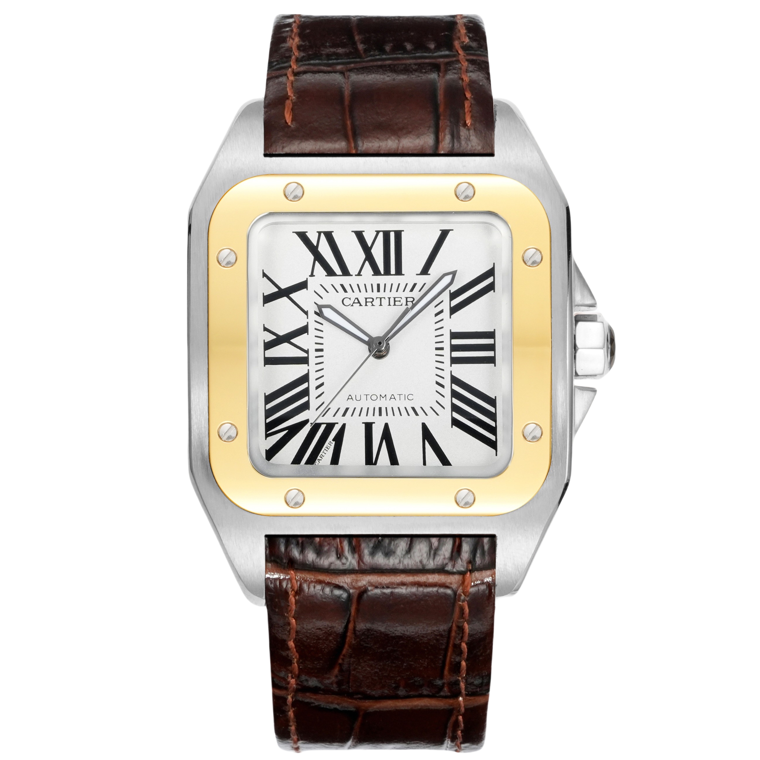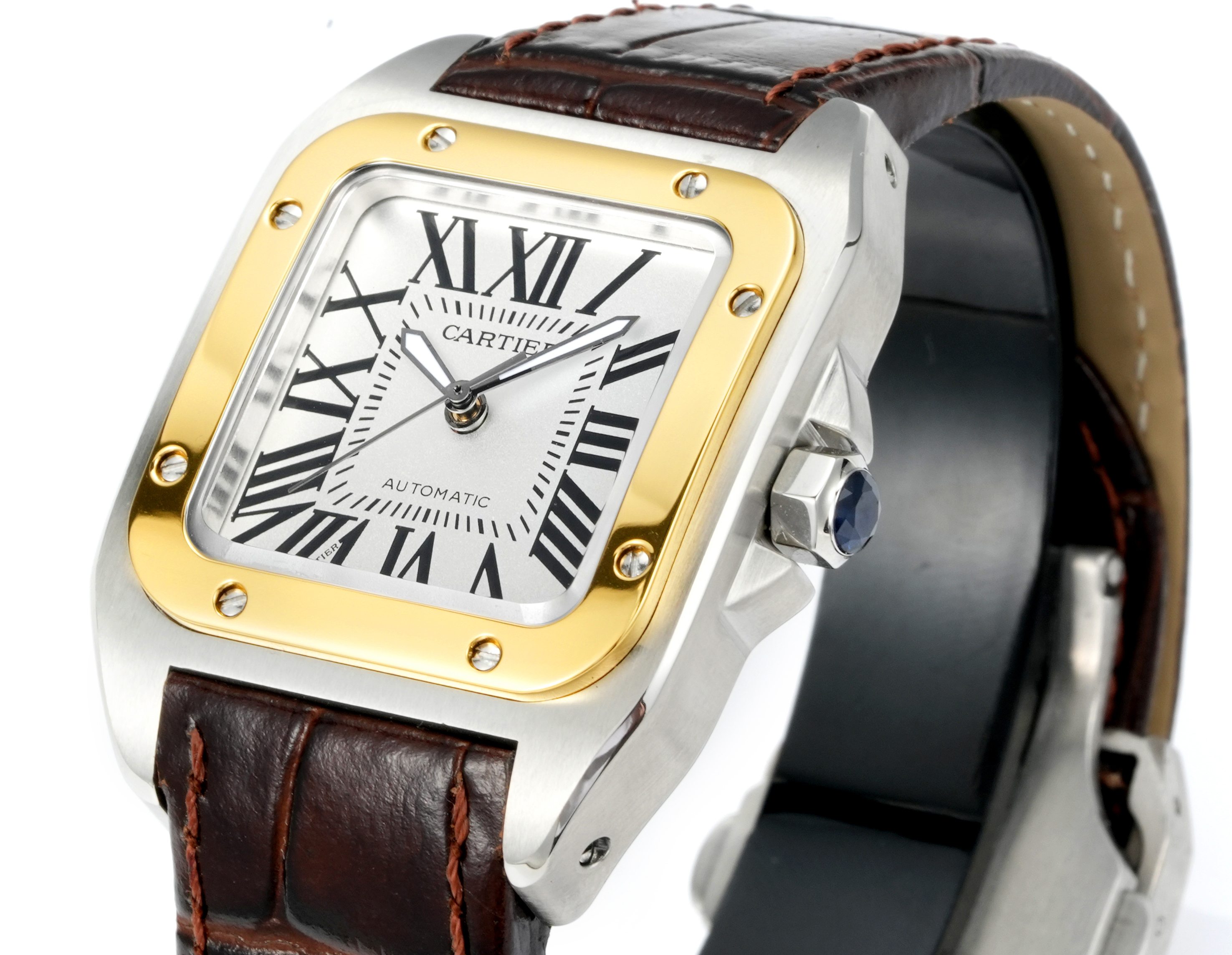 Cartier Santos 41.3mm White Dial Yellow Gold Steel Bezel Brown Leather Strap W22071Y1