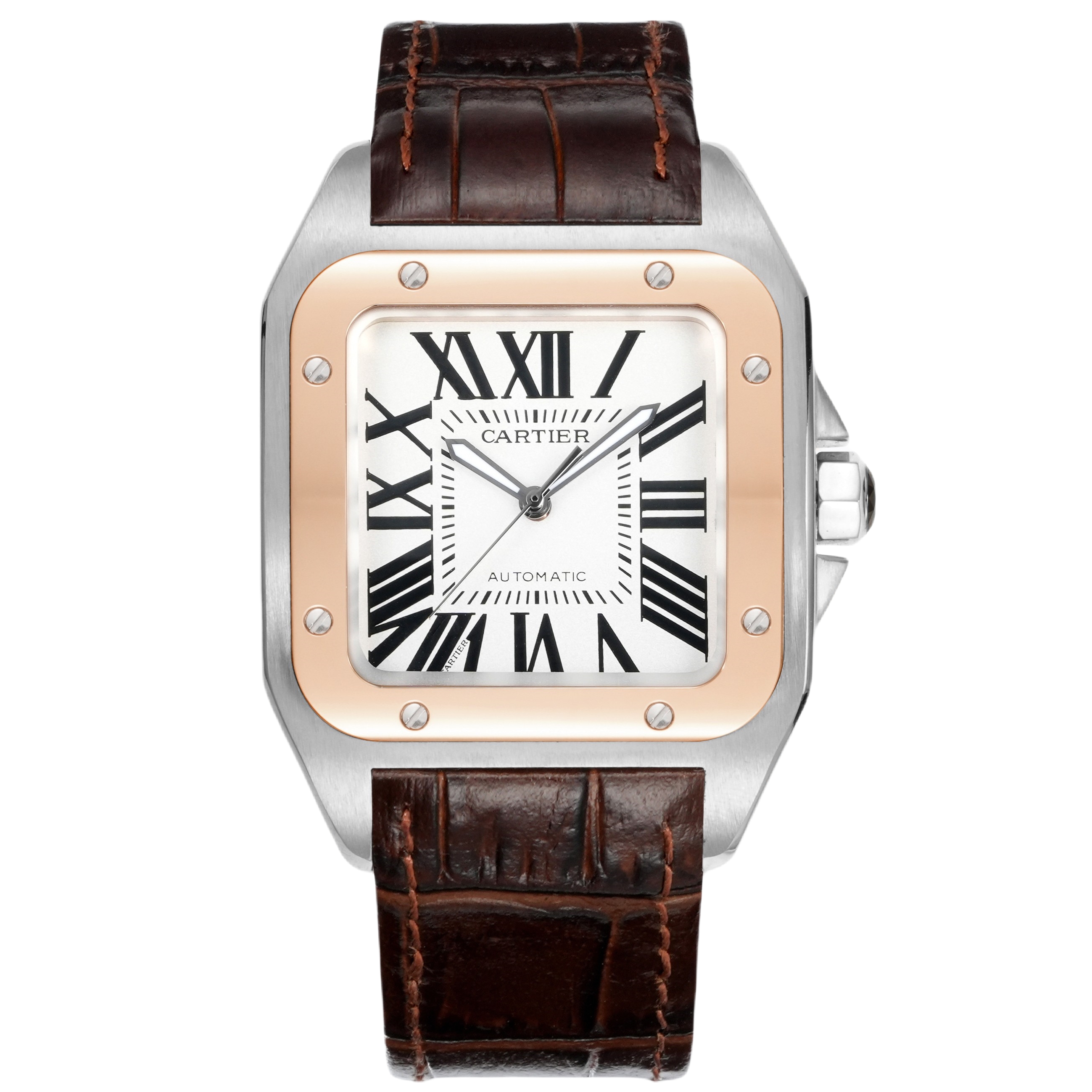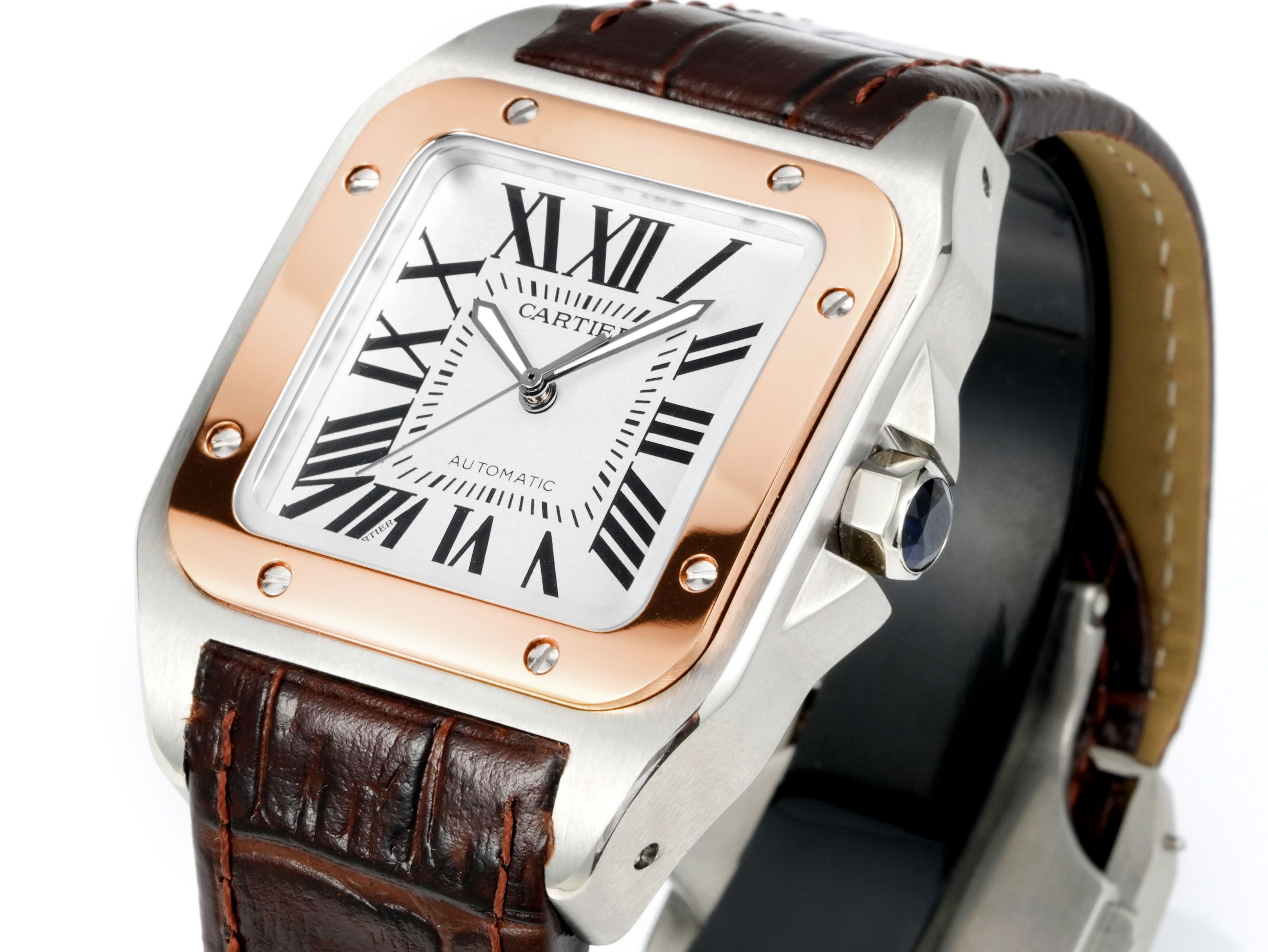 Cartier Santos 41.3mm White Dial Rose Gold Steel Bezel Brown Leather Strap W23071Y1