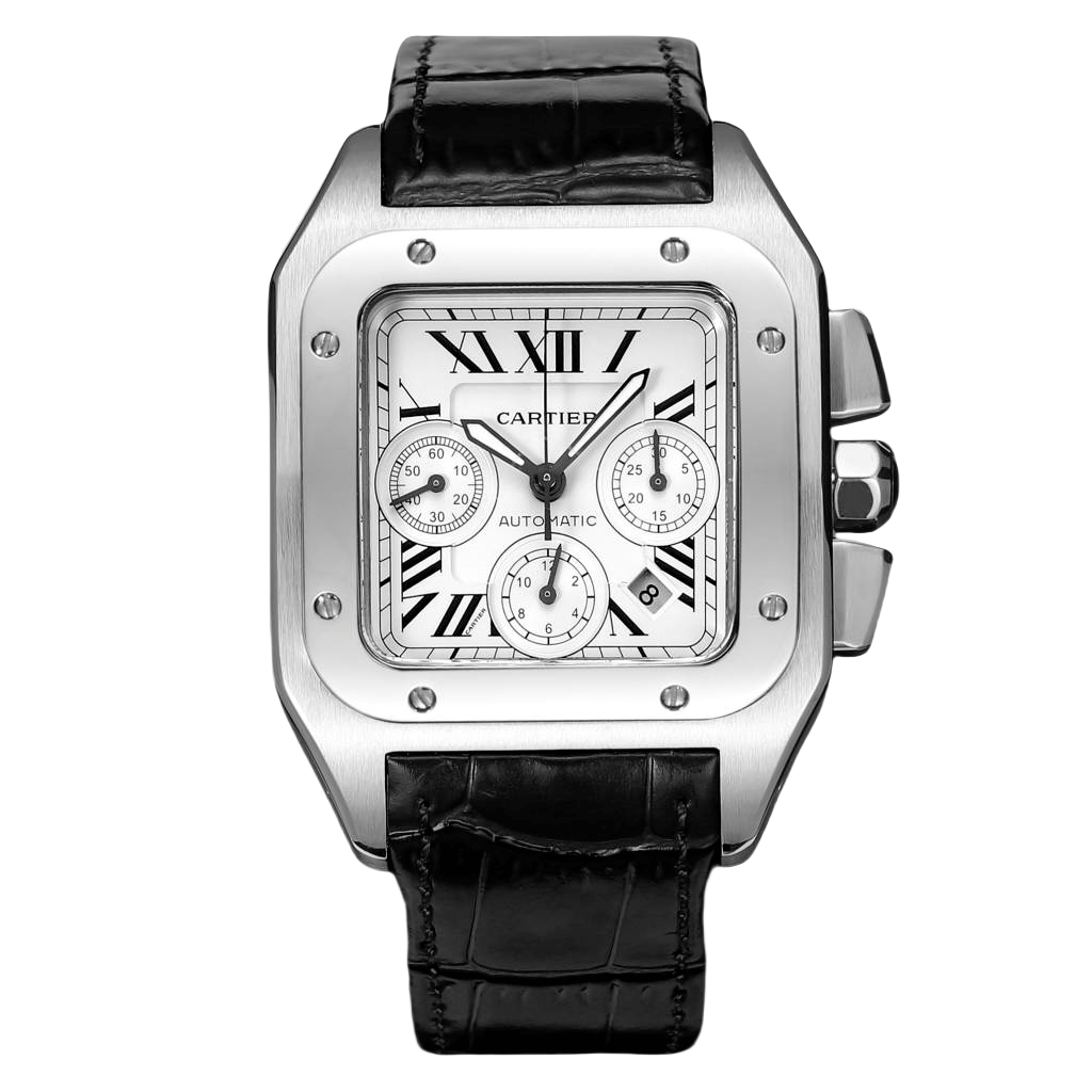 Cartier Santos 42mm White Dial Steel Bezel Black Leather Strap W20090X8