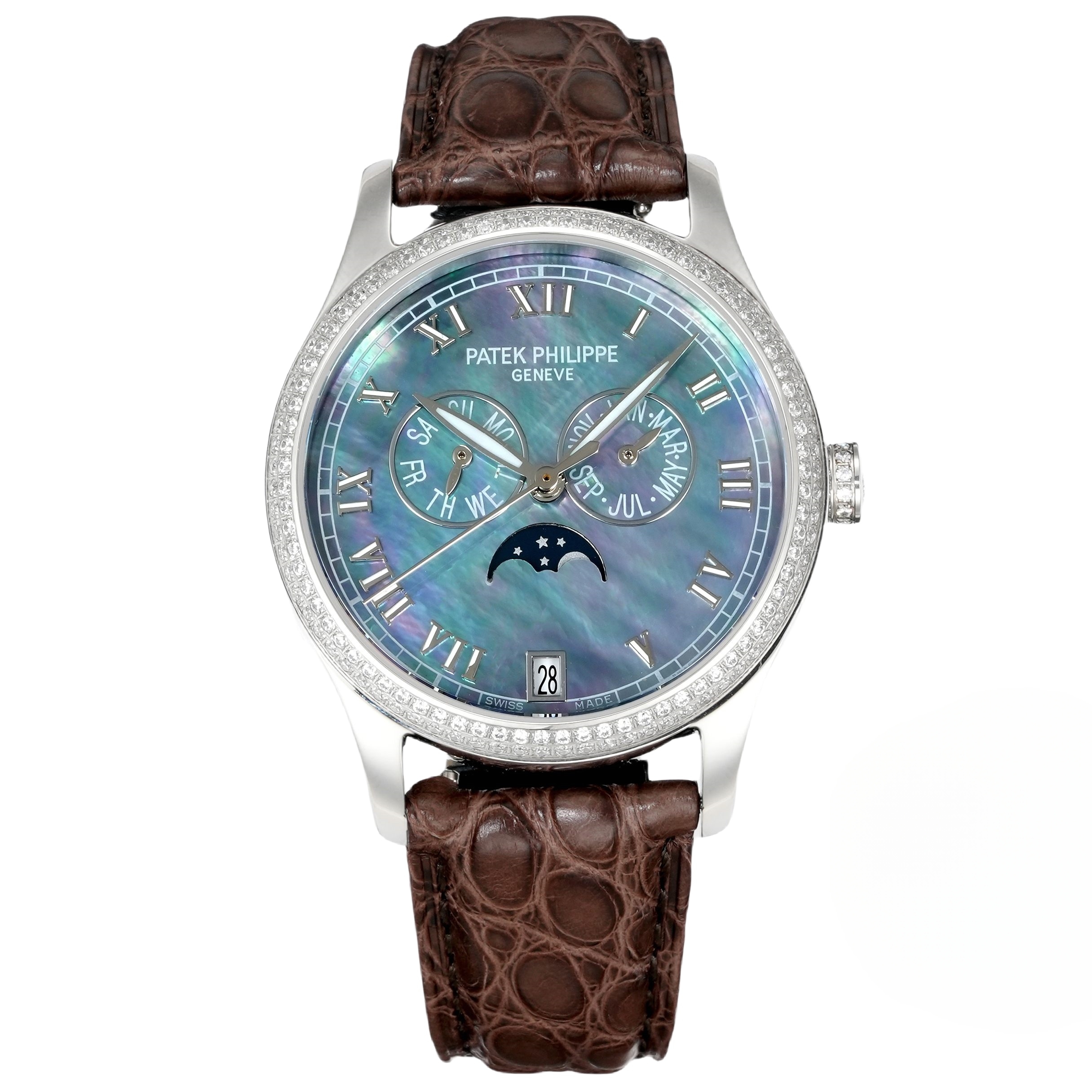 Patek Philippe Complications 37mm Pearl Dial Diamond Bezel Brown Leather Strap 4936G-001 Woman Ladies