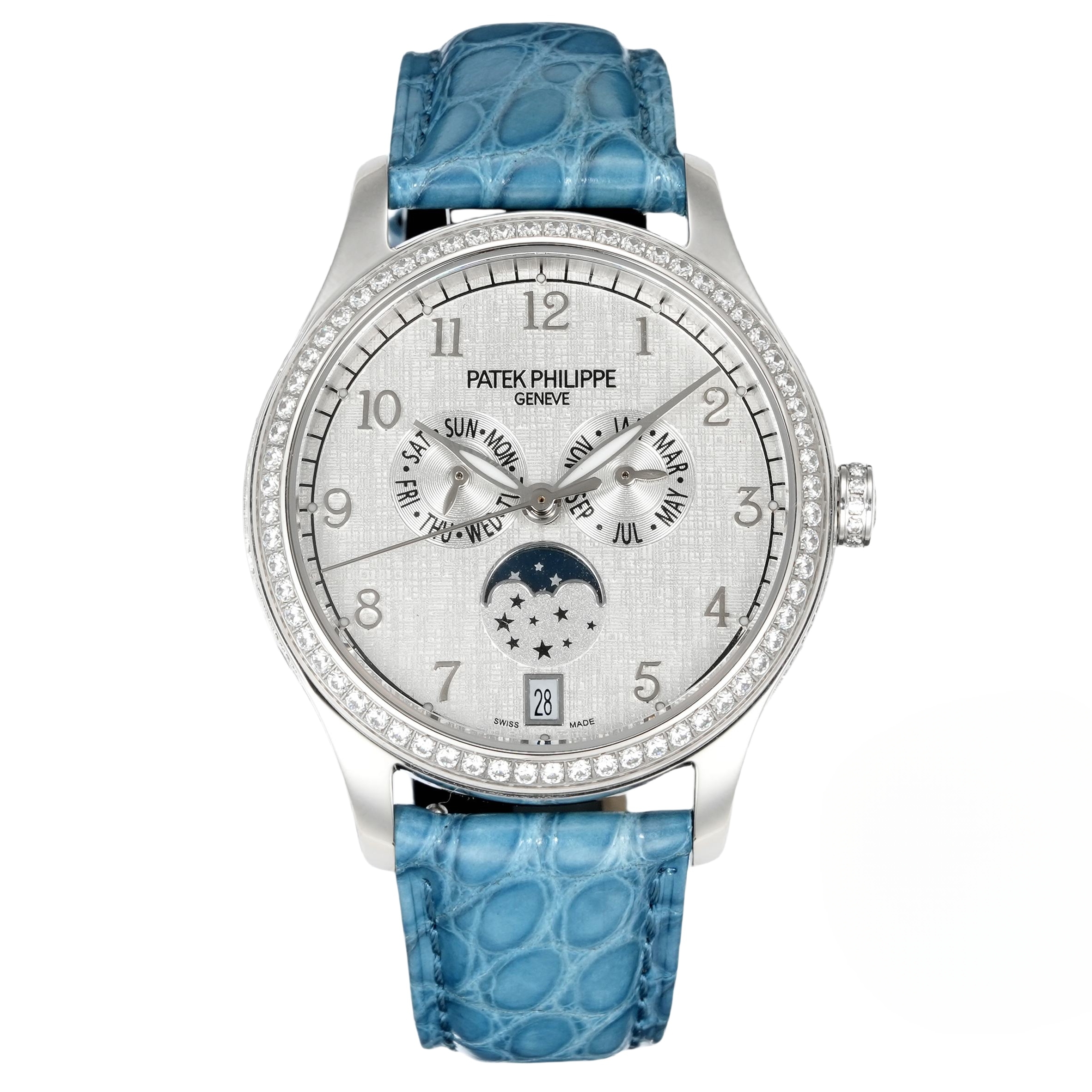 Patek Philippe Complications 38mm White Satin Dial Steel Diamond Bezel Blue Leather Strap 4947G-010 Woman Ladies