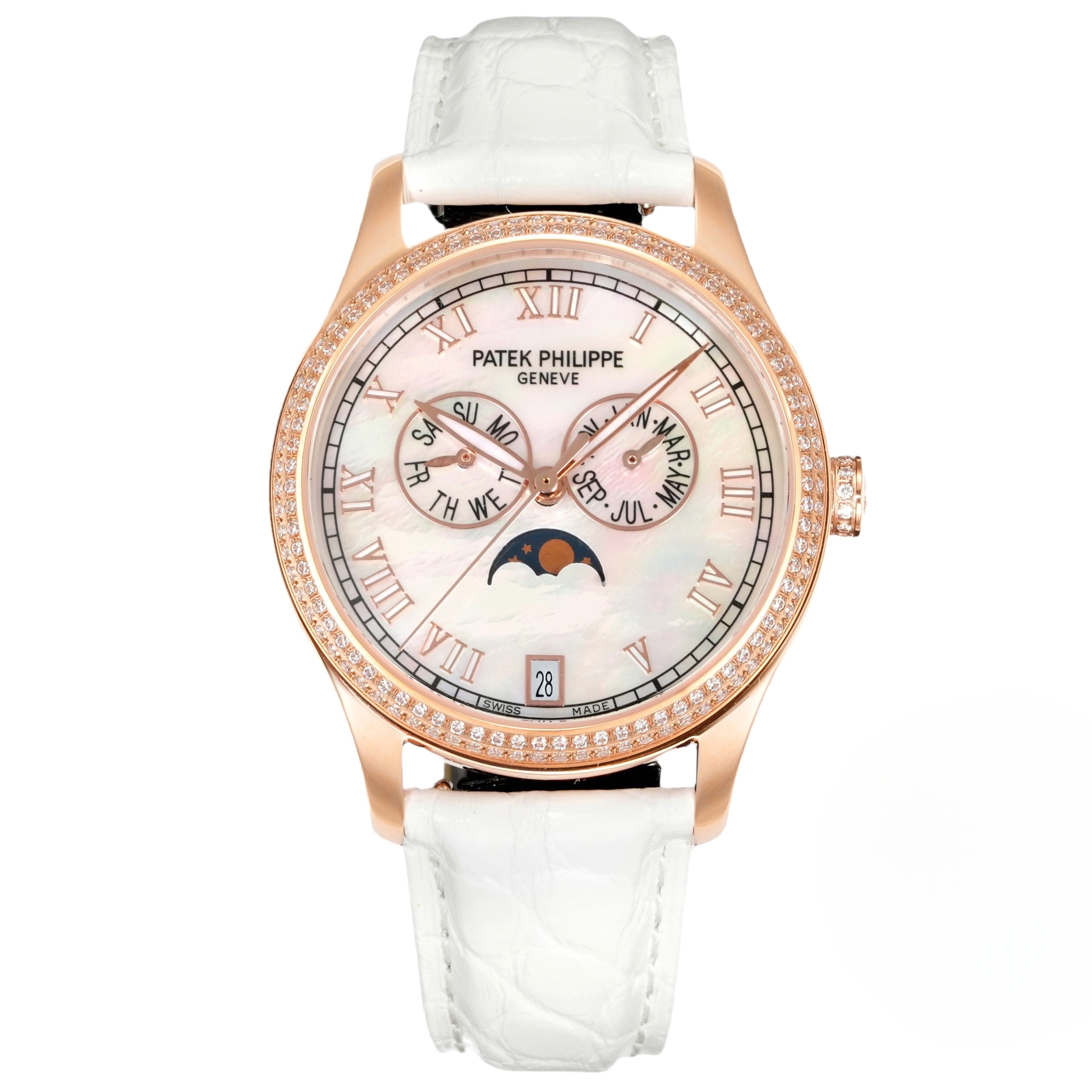 Patek Philippe Complications 37mm White Pearl Dial Rose Gold Diamond Bezel White Leather Strap 4936R-001 Woman Ladies