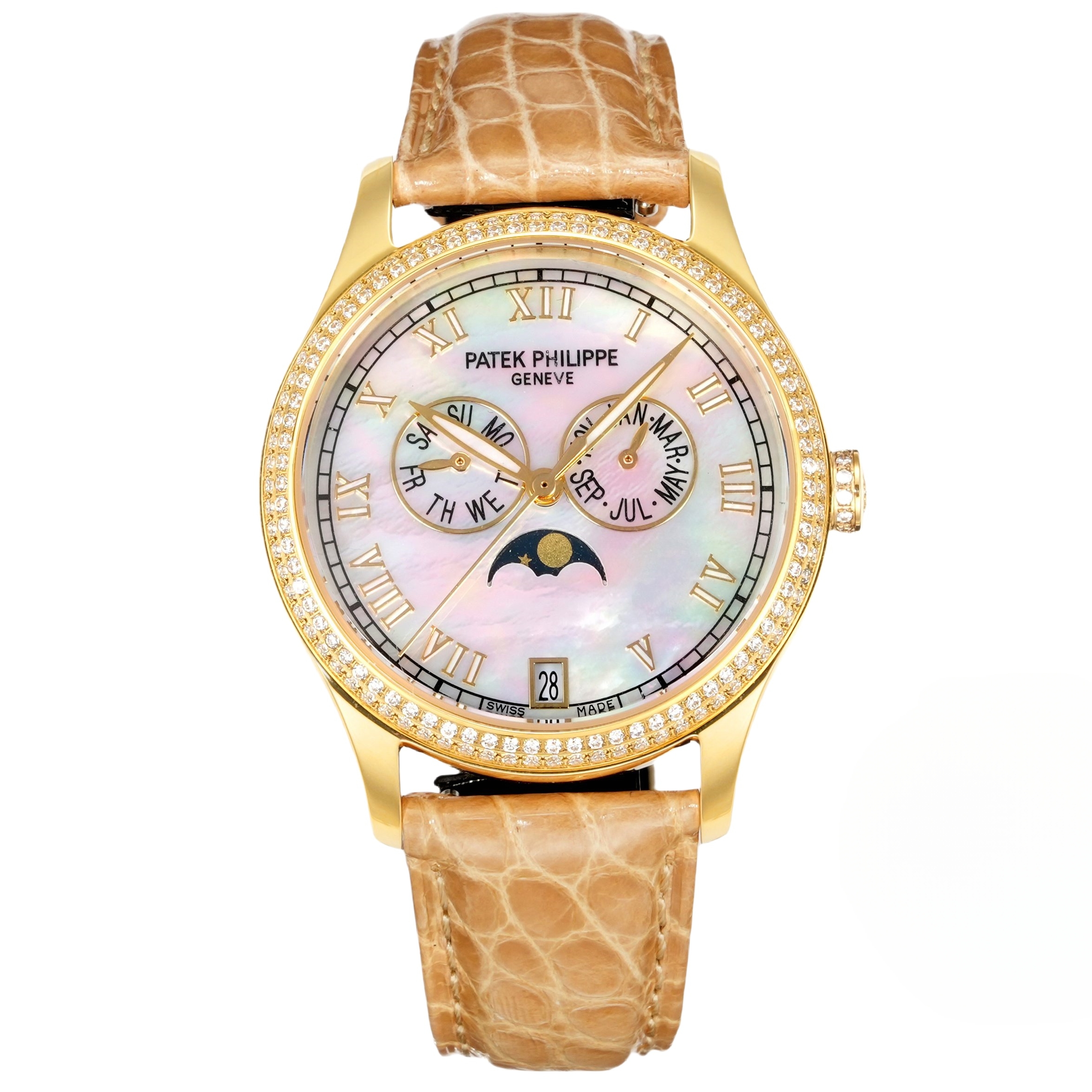 Patek Philippe Complications 37mm White Pearl Dial Yellow Gold Diamond Bezel Yellow Leather Strap 4936J-001 Woman Ladies