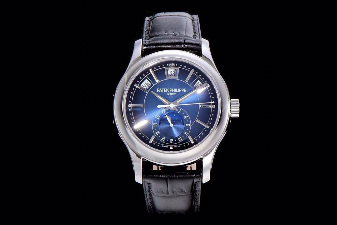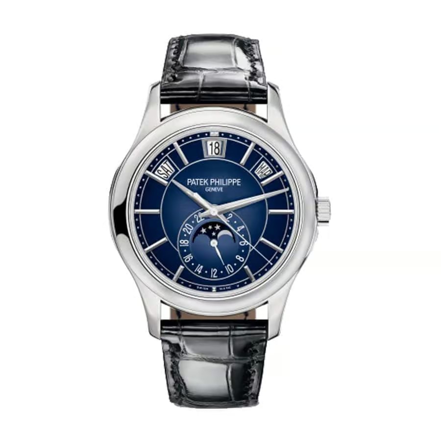 Patek Philippe Complications 40mm Blue Dial Steel Bezel Black Leather Strap 5205G-013