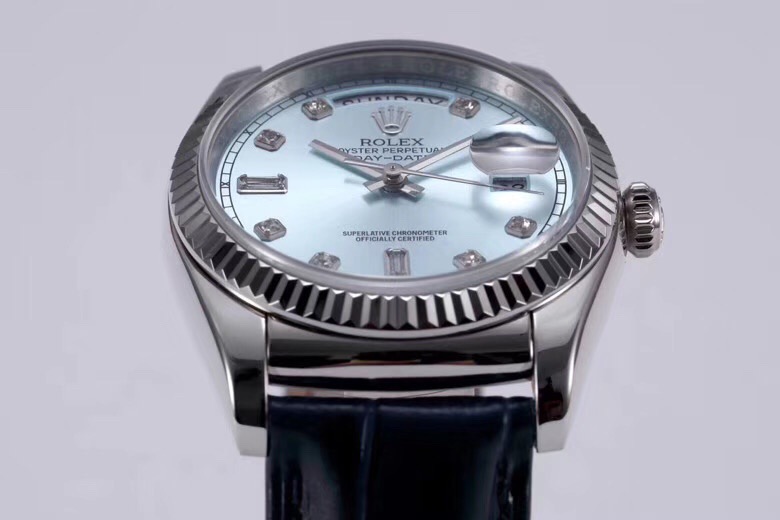• Rolex Day-Date 36mm 40mm Dial Diamond Ice Blue Platinum Blue Leather 118139
