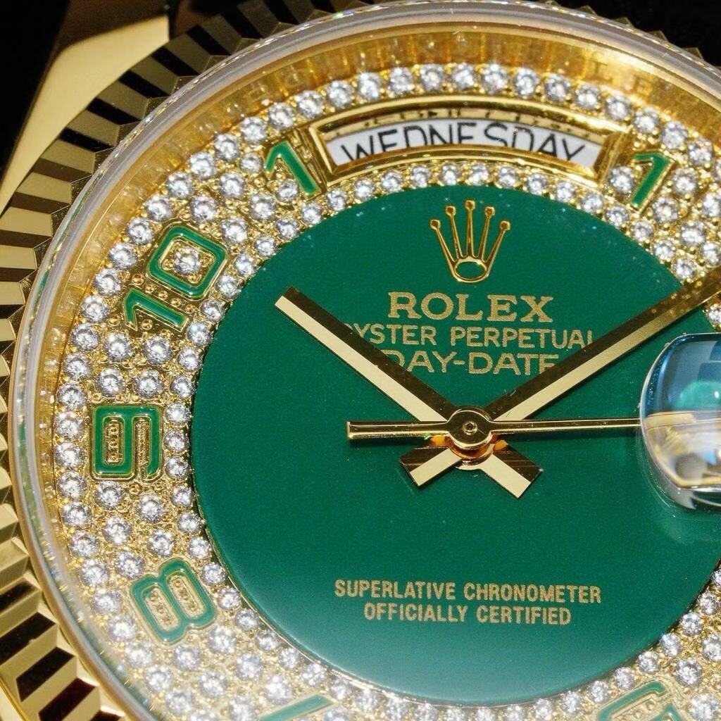 • Rolex Day-Date 36mm Dial Green Diamond Yellow Gold Strap Green Leather 118138