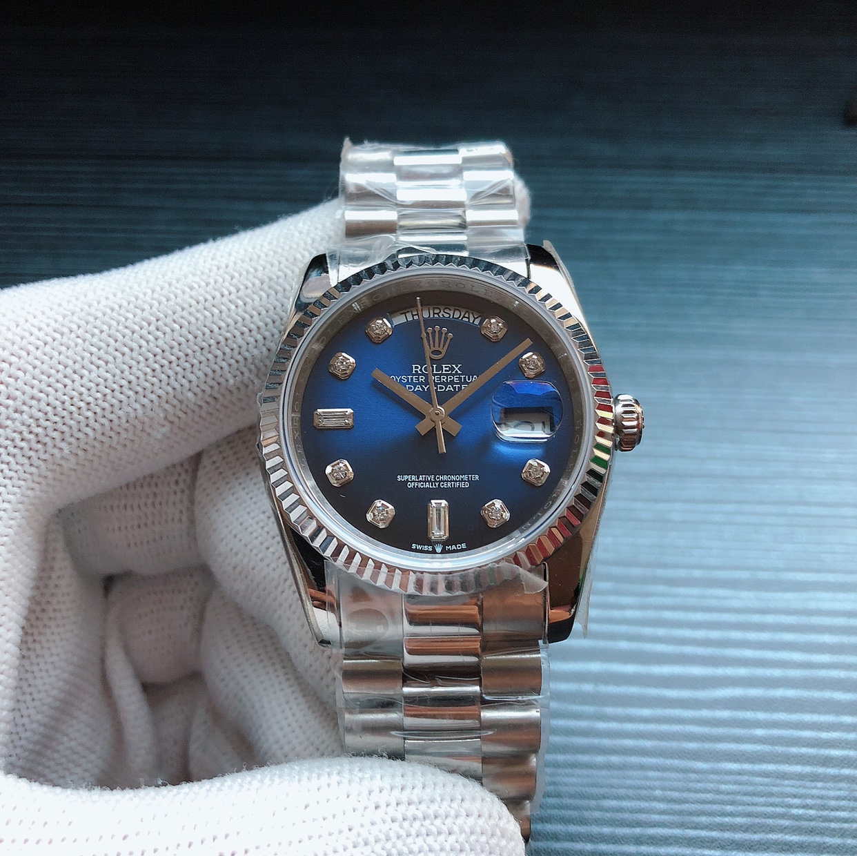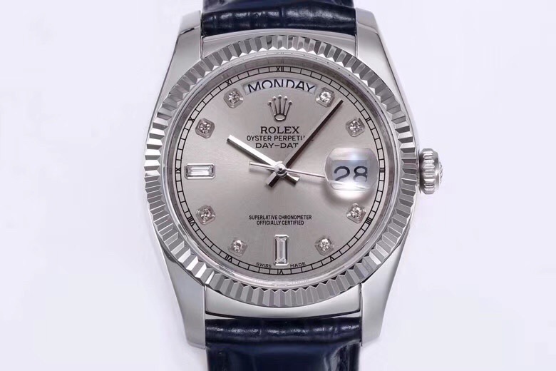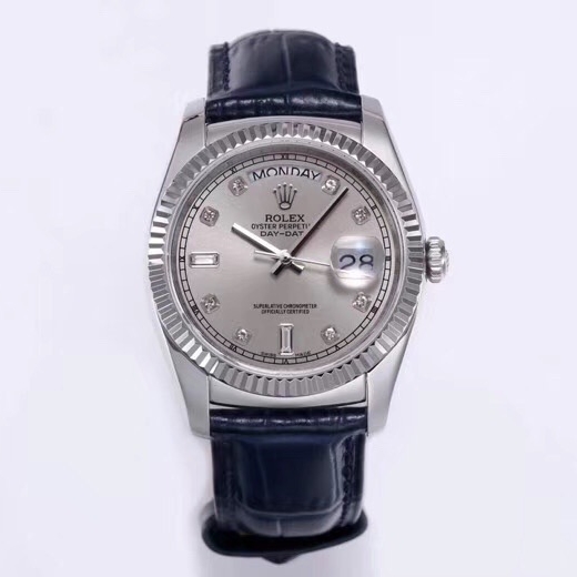 Rolex Day-Date 36mm 40mm Dial Diamond Silver Platinum Blue Leather 118139-0081
