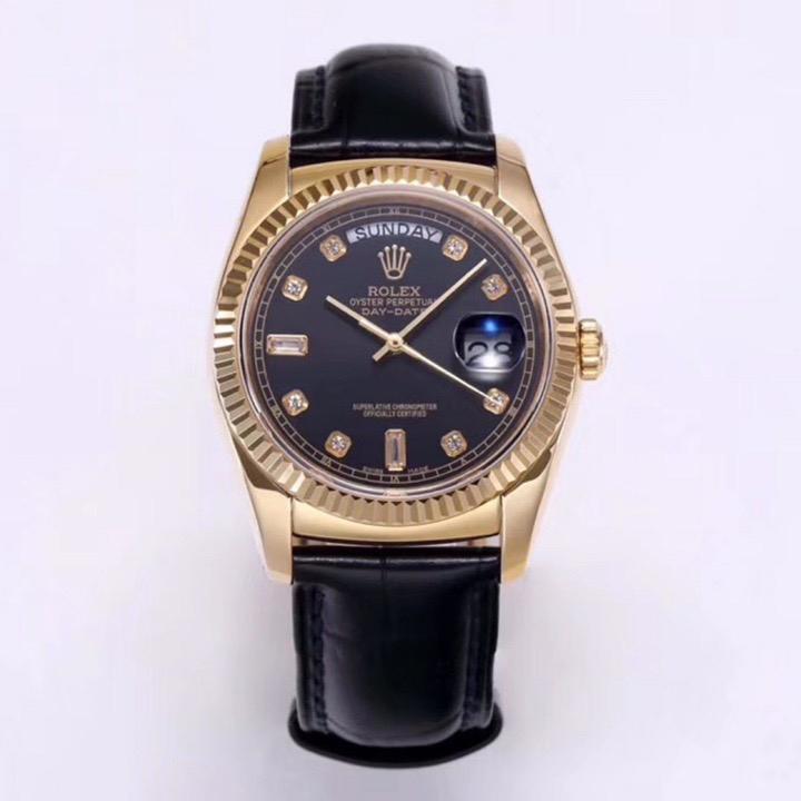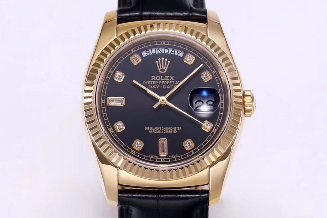Rolex Day-Date 36mm 40mm Dial Black Diamond Yellow Gold Black Leather 118138