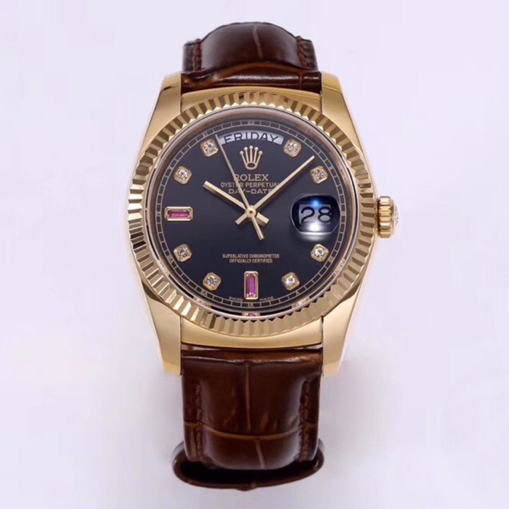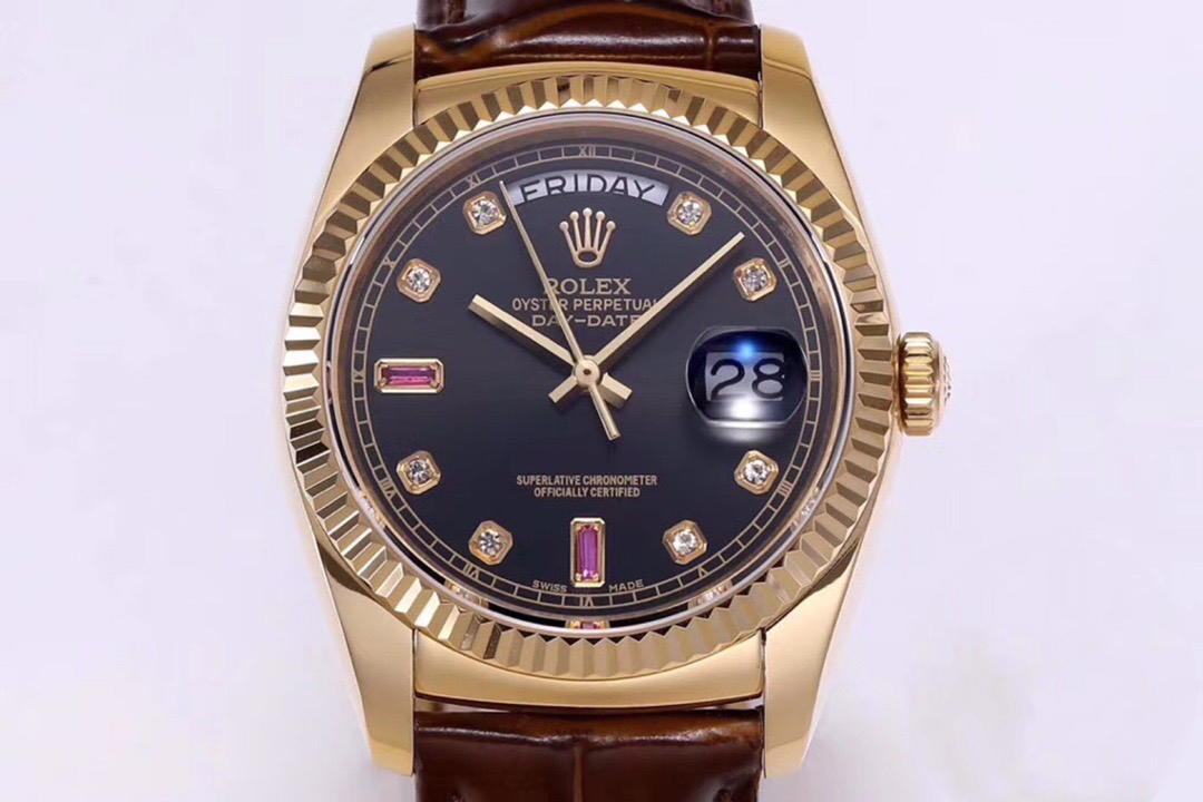 Rolex Day-Date 36mm 40mm Dial Black Diamond Ruby Yellow Gold Brown Leather 118138