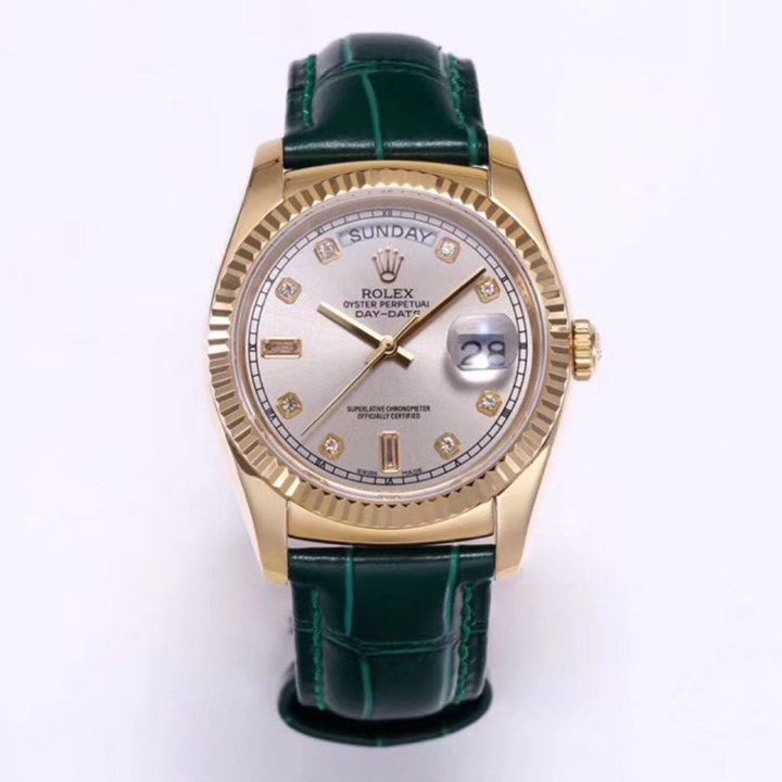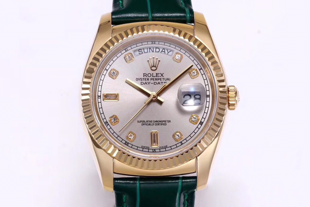 Rolex Day-Date 36mm 40mm Dial Silver Diamond Yellow Gold Green Leather 118138-0135