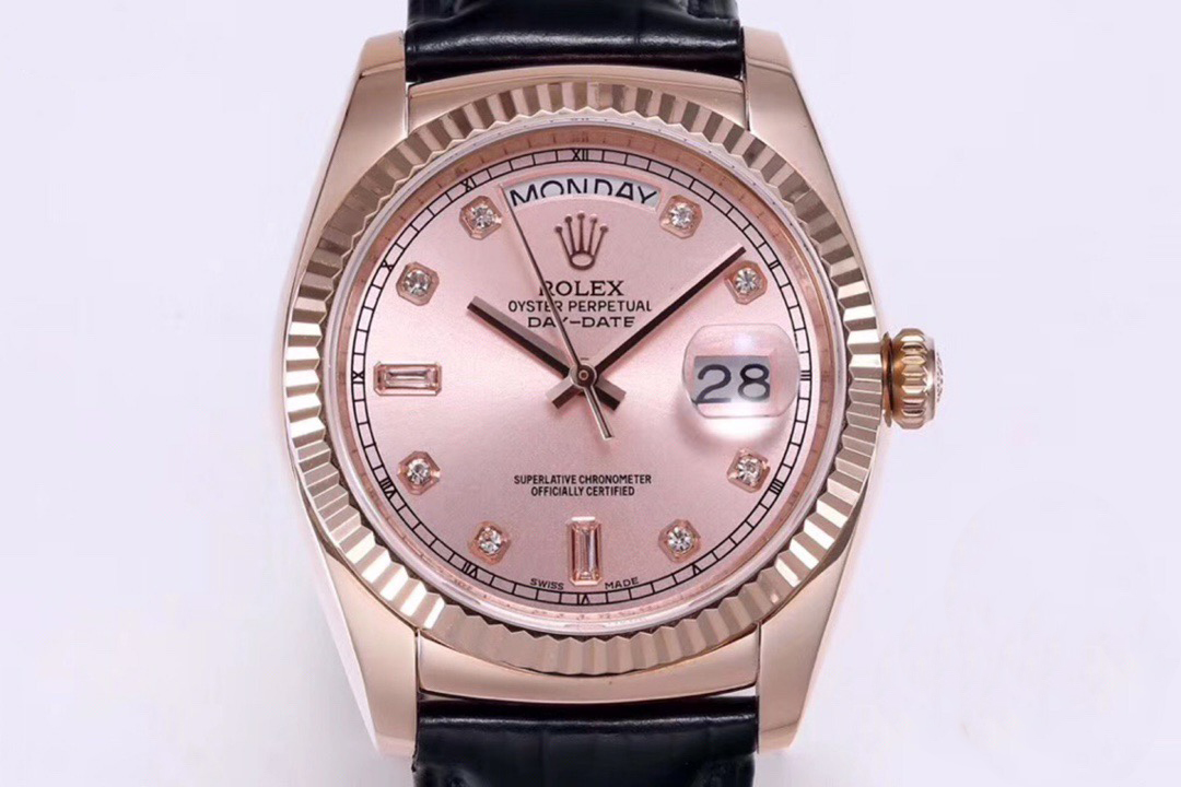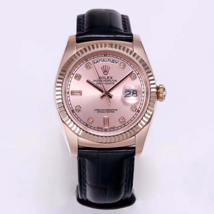 Rolex Day-Date 36mm 40mm Dial Pink Diamond Rose Gold Black Leather 118135-0101