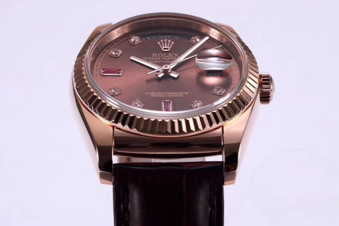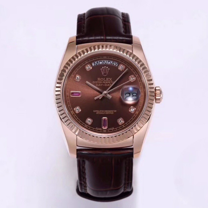 Rolex Day-Date 36mm 40mm Dial Chocolate Diamond Ruby Rose Gold Brown Leather 118135-0022
