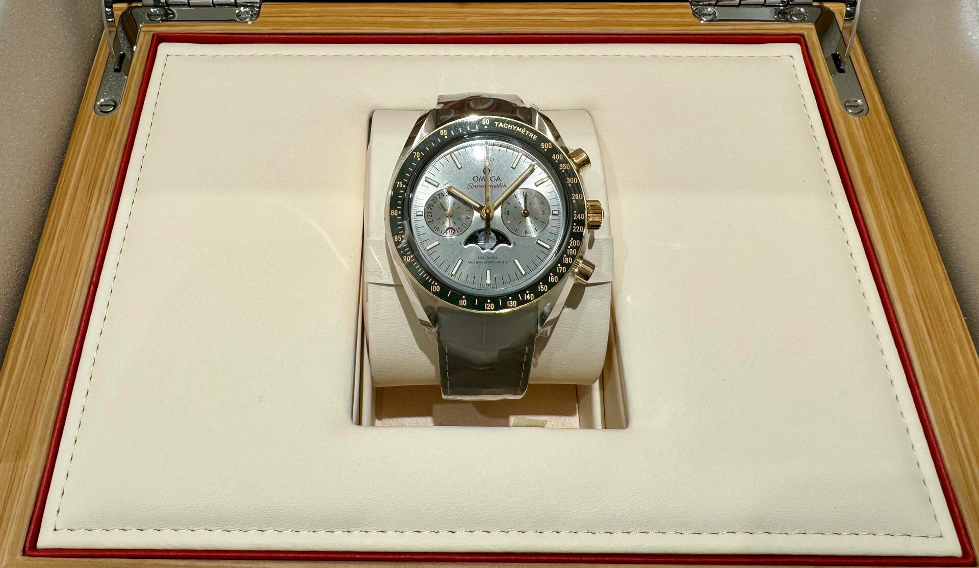 | Omega Speedmaster Phase Of The Moon 44.25mm Grey Dial Green Yellow Gold Bezel Grey Leather 304.33.44 | |