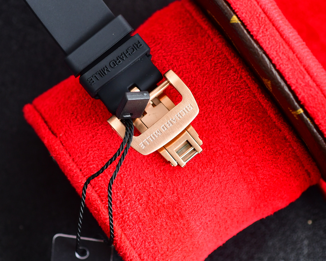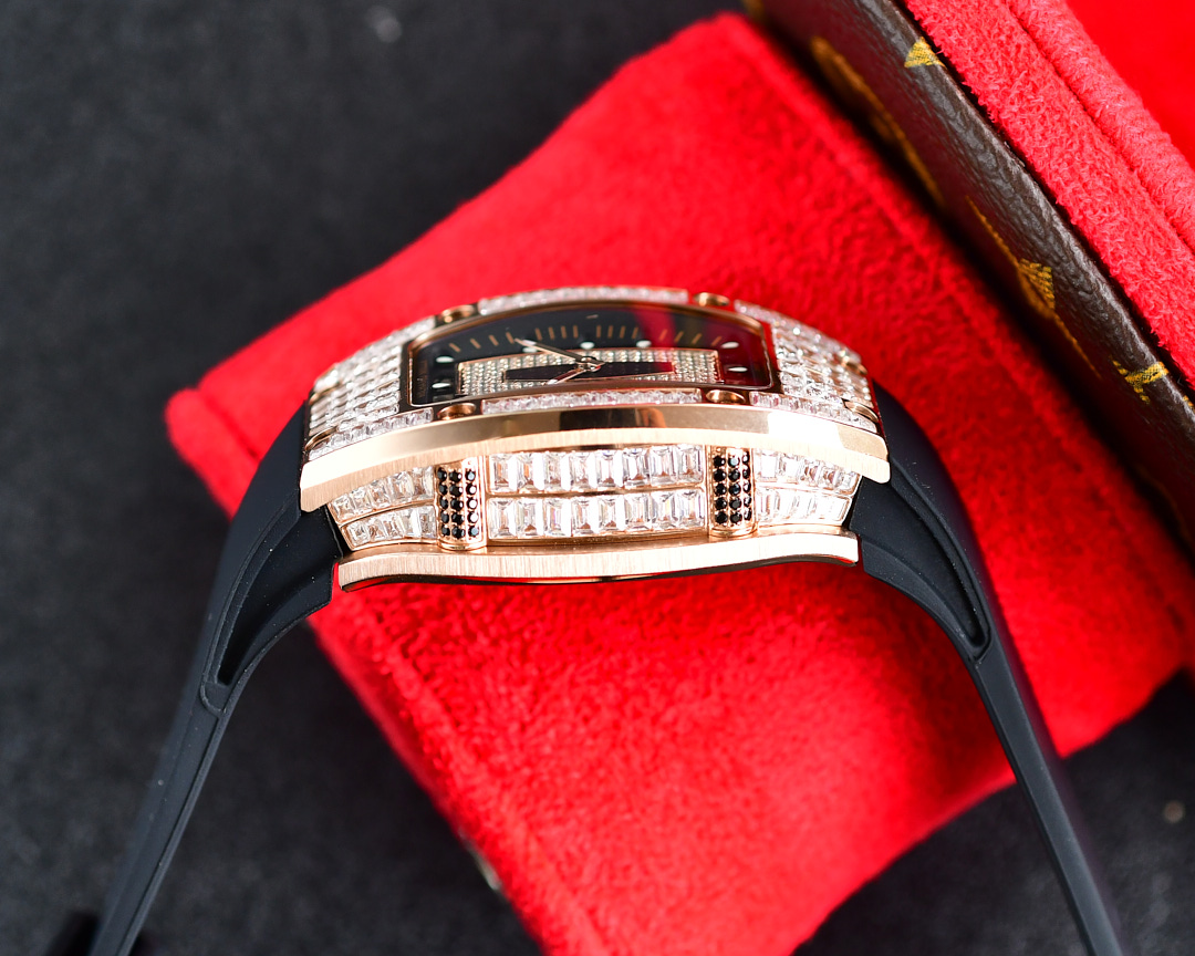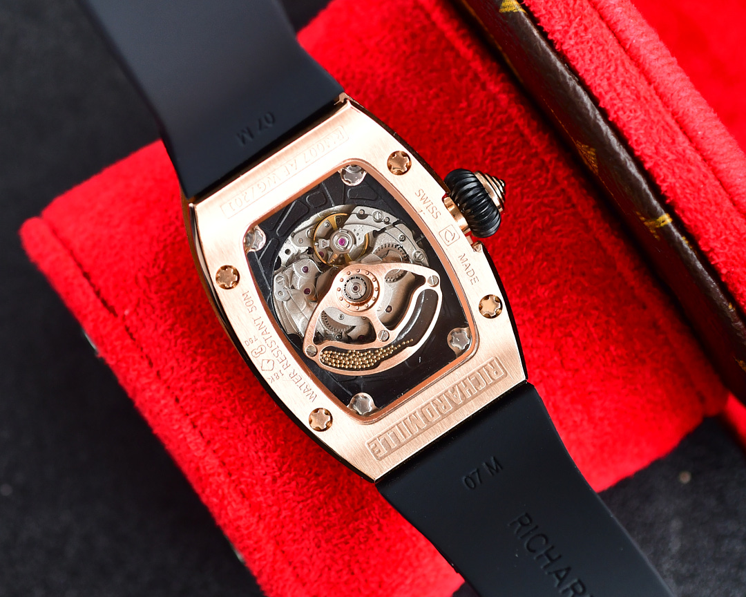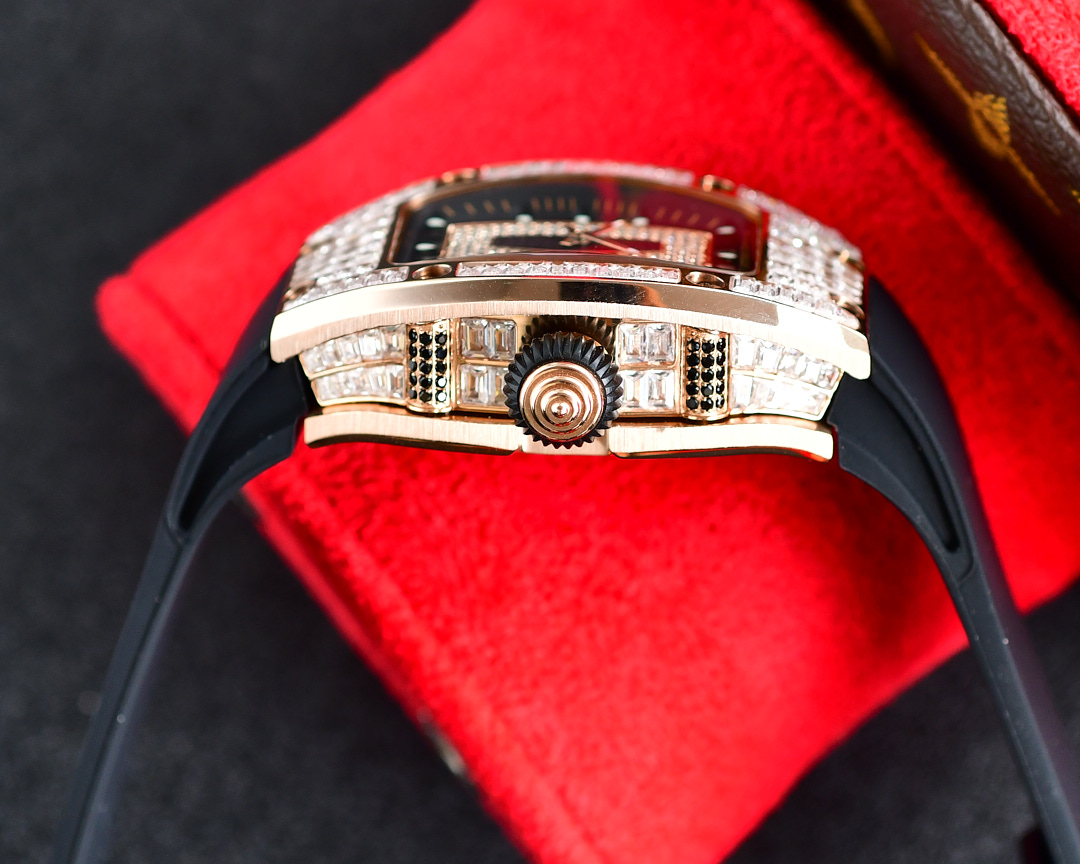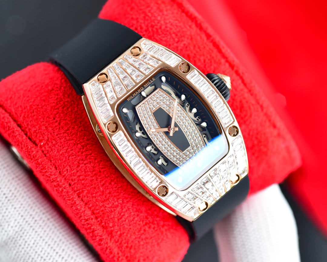 • Richard Mille RM07-01 45.66mm x 31.40mm Diamond Black Dial Rose Gold Square Diamond Bezel WhiteBlack Rubber Strap Ladies Woman