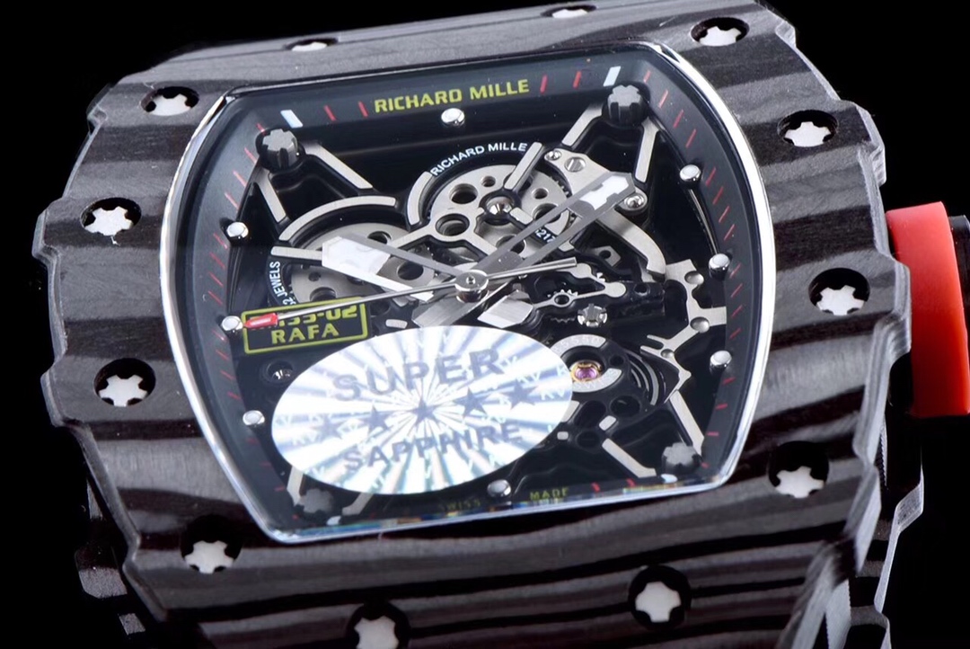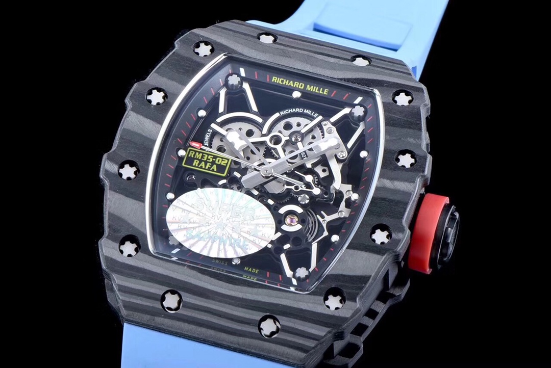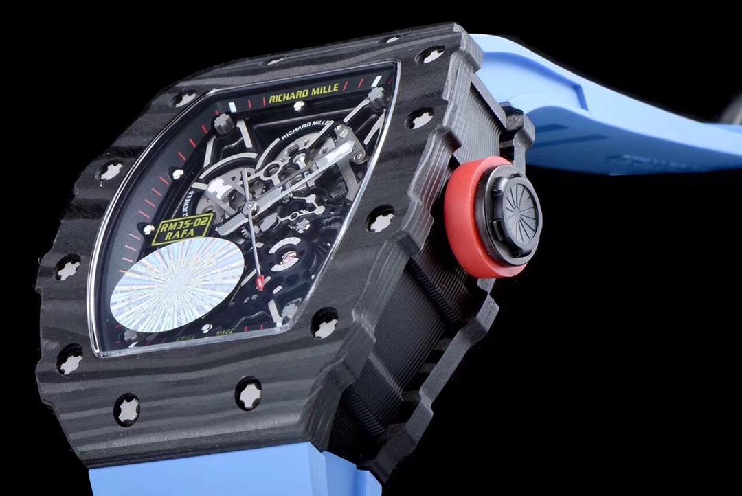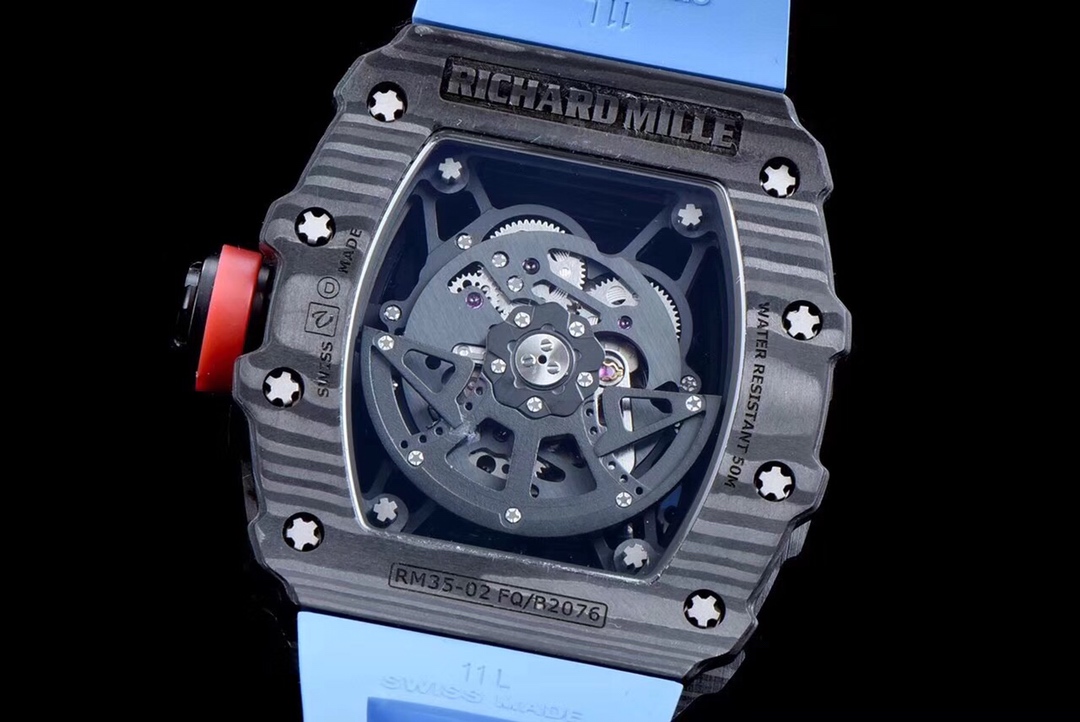 | Richard Mille RM35-02 49.94mm x 44.50mm Grey Hollow Dial Black Carbon Fiber Bezel Blue Rubber Strap | |