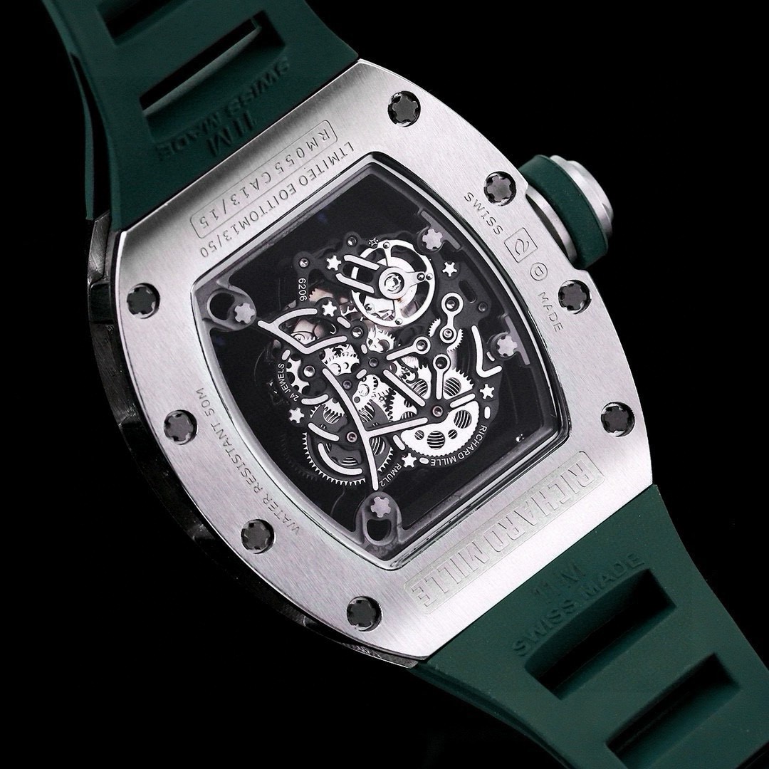 | Richard Mille RM 055 49.90mm x 42.70mm Grey Hollow Dial Titanium Bezel Green Rubber Strap | |